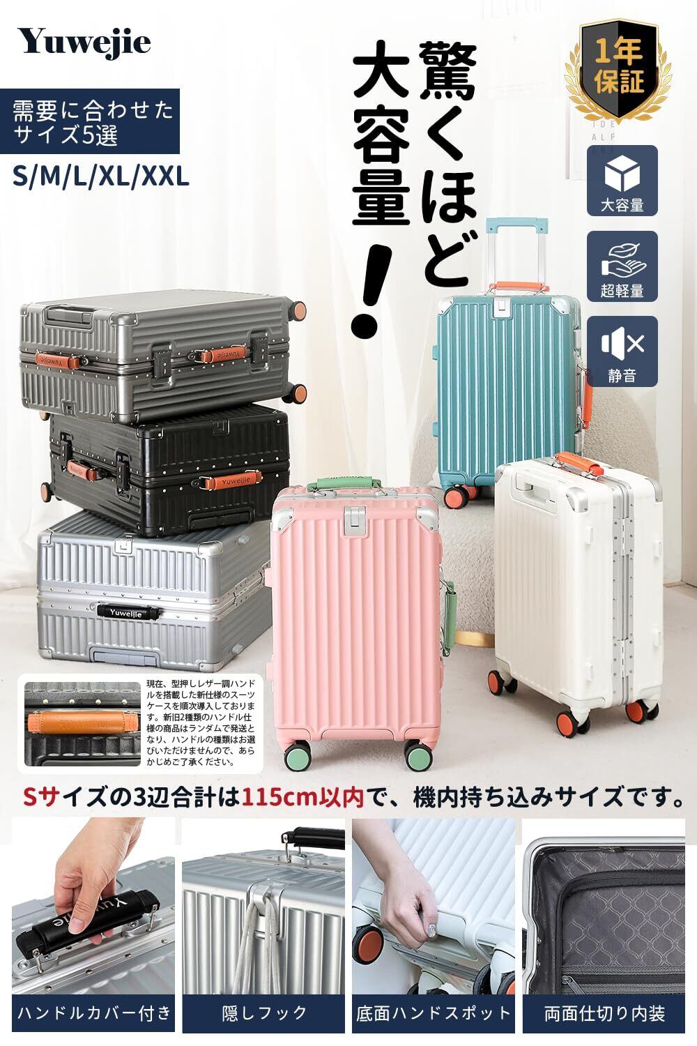 【便利なトップハンドルと下部ハンドル】スーツケースの上部と下部には、便利なハンドルが搭載されており、電車やバスなどの公共交通機関で荷物を簡単に持ち上げて運ぶことができます。特に、荷物棚に収納する際、これらのハンドルが便利で、スムーズに持ち上げて設置することができます。さらに、上部のハンドルとメインハンドルにはレザー製のカバーが施され、ブランドロゴが刻印されており、ファッション性と快適な握り心地を提供します。