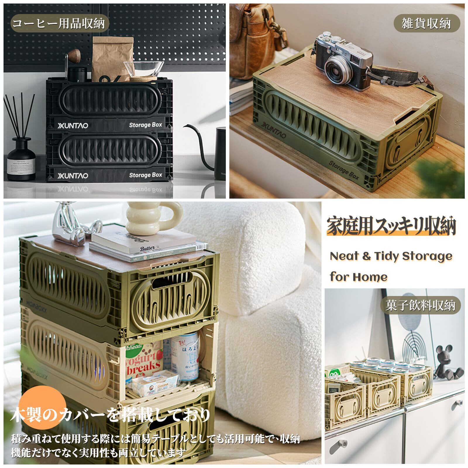 収納ボックス 折り畳み コンテナ ボックス 木製の蓋付き 収納ケース 折りたたみ キャンプ収納 カゴ 小物入れ 卓上収納 おしゃれ box 収納 組立簡単 積み重ね ブラック 小サイズ:2個 W30×D20×H12cm