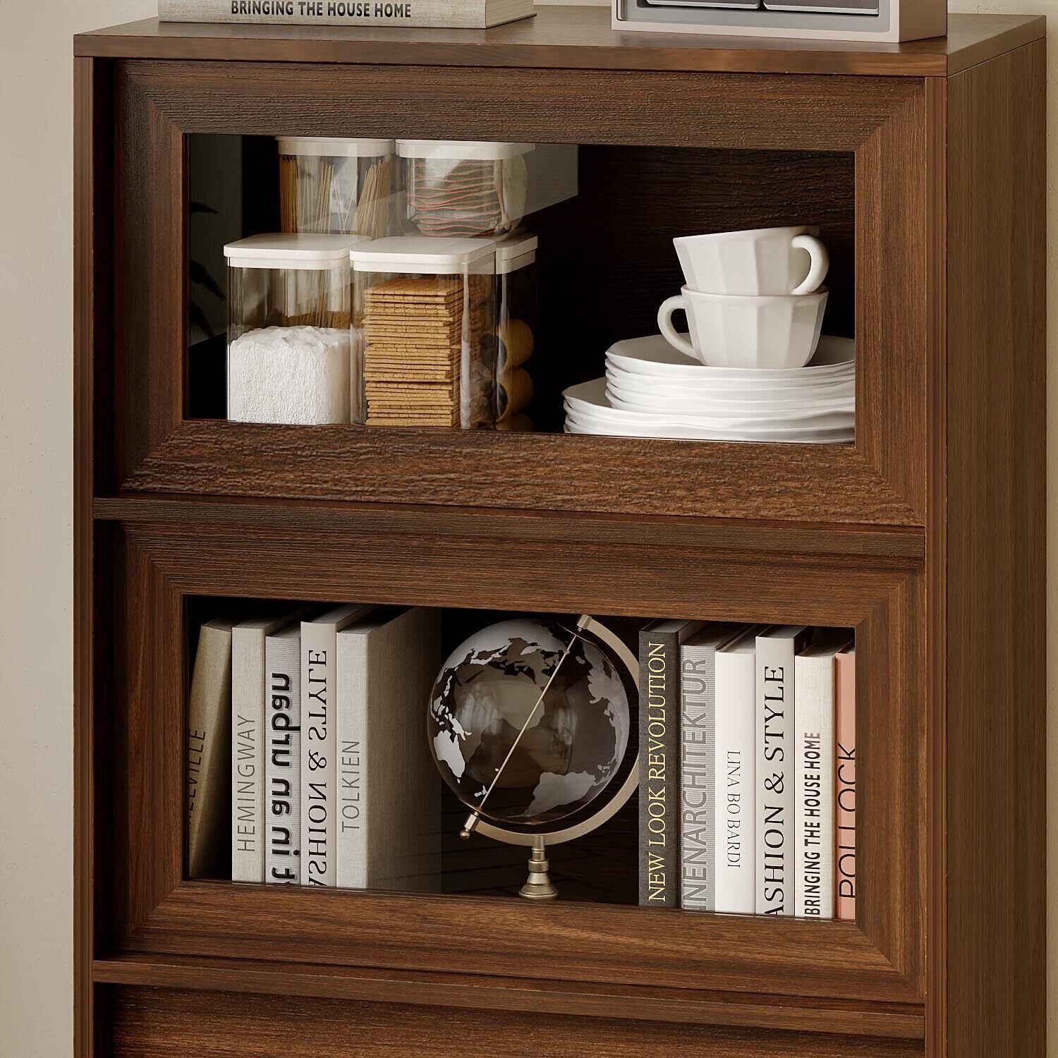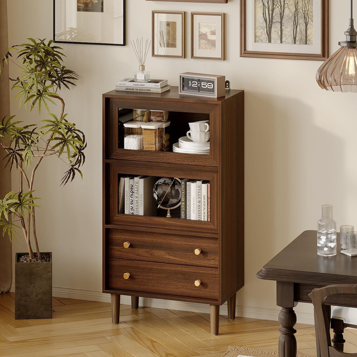 幅60 木製ガラスキャビネット 上段ディスプレイ扉付き スリムサイドボード 引き出し収納 リビング・キッチン・寝室対応 北欧ナチュラル おしゃれ収納ラック