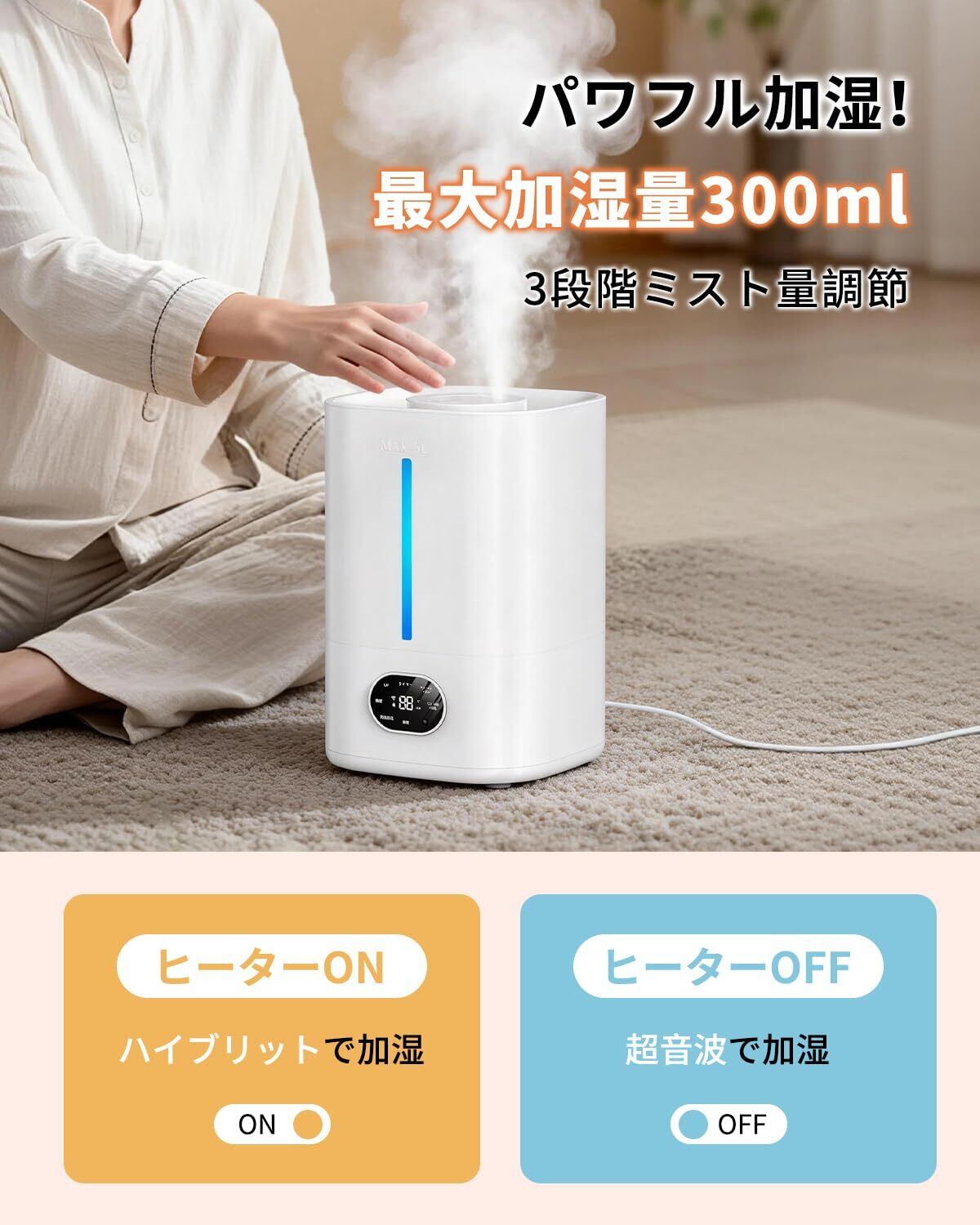 【ハイブリッド式!パワフルかつ清潔に加湿】加熱式x超音波の大容量加湿器は、「加湿能力不足」「雑菌繁殖で不安」などの悩みにサヨナラ!! 最大300mL/hの驚異な加湿能力を持ってます。最大28畳の空間に適応!リビング、寝室、オフィスなど大スペース用の加 湿器としてもストレスなし!5L大容量タンクを使用し、一回の給水で最大25時間と長時間使用できるので、頻繁に給水不要お部屋を乾燥した季節でも快適な湿度を保ちます。お肌や喉の乾燥を防げて病気も予防できます。夜間の給水ストレスから完全に解放され、最長25時間以上の連続運転が可能です。乾燥対策を徹底したい、長時間快適な湿度を保ちたいシーンに最適です。