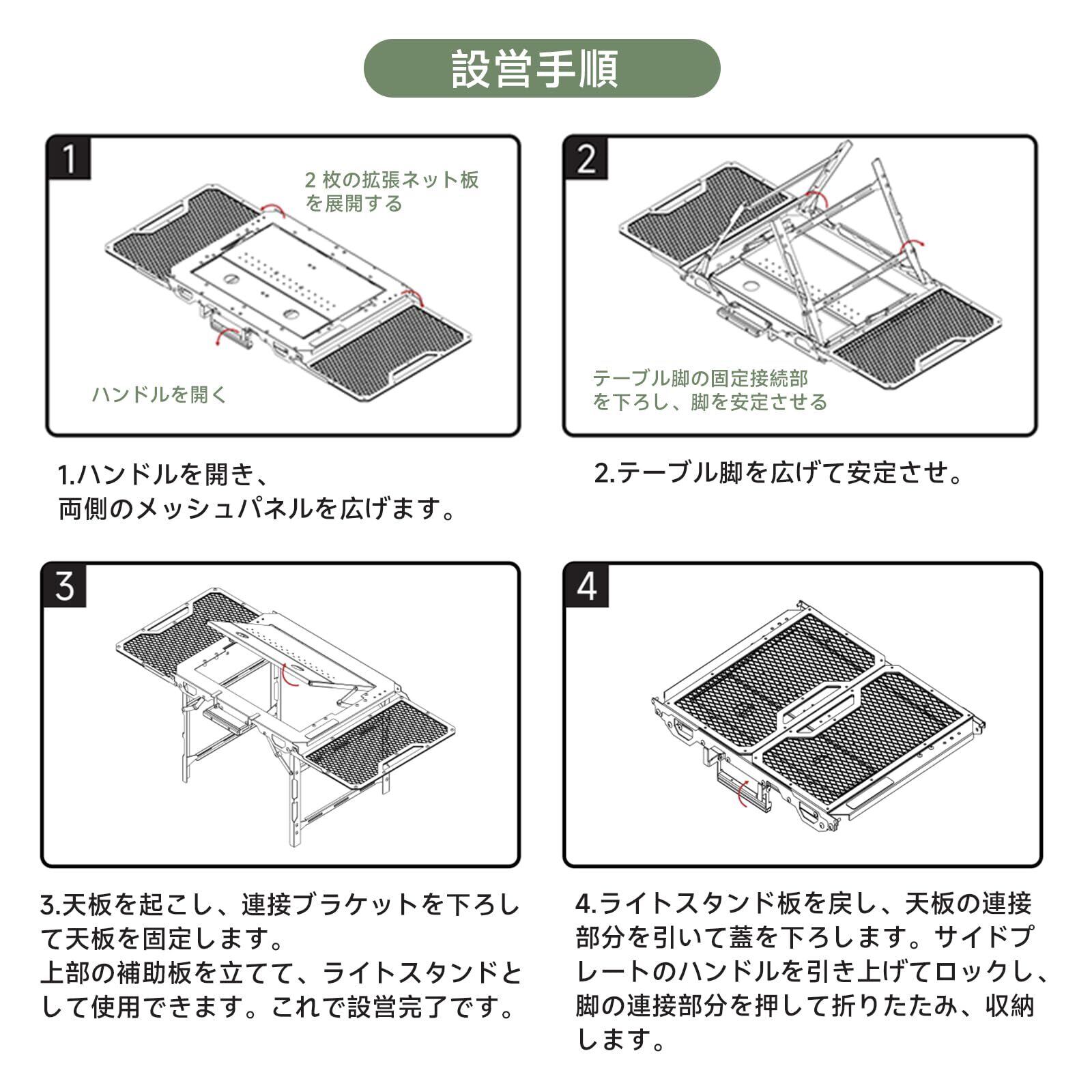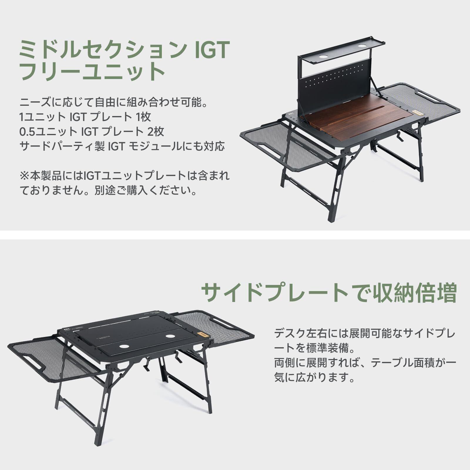 【便利な多目的設計】一体型の折りたたみ構造により、組み立ては不要で、約30秒で素早く設置できます。天板には小型の棚が内蔵されており、小物の整理に便利です。さらに、IGTデザインにも完全対応。アウトドアテーブルとしてだけでなく、日常のさまざまなシーンでお使いいただけます。