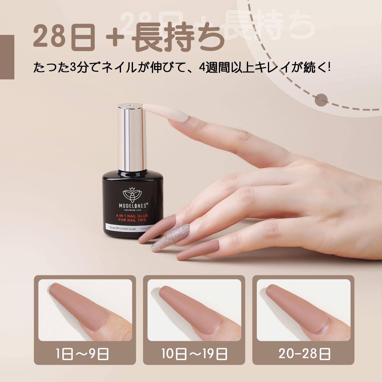 21日間持続:細かいブラシアプリケーターを備えた、爪を迅速に接着し長持ちさせます。適切なステップに従って、最長3-4週間以上持続できます