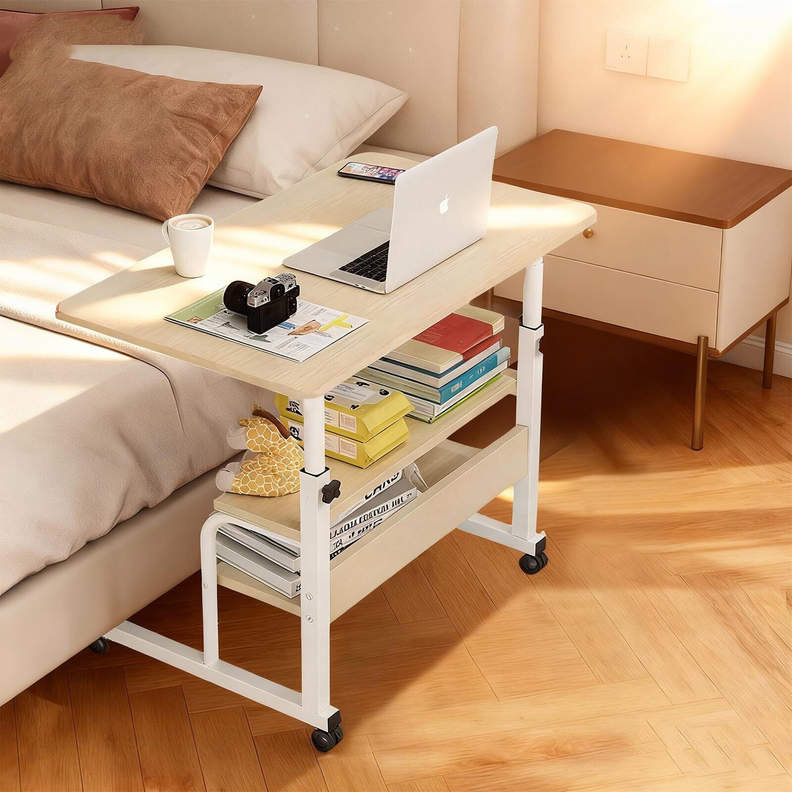 サイドテーブル ベッドテーブル キャスター付き 移動式 昇降式サイド サイドデスク 高さ調節 組み立て簡単 省スペース 作業台 安定性 角が丸い 移動便利 パソコン ソファサイド ベッドサイドデスク 多機能 家庭用 ブラック (ウォームホワイト, 80*40 2段)