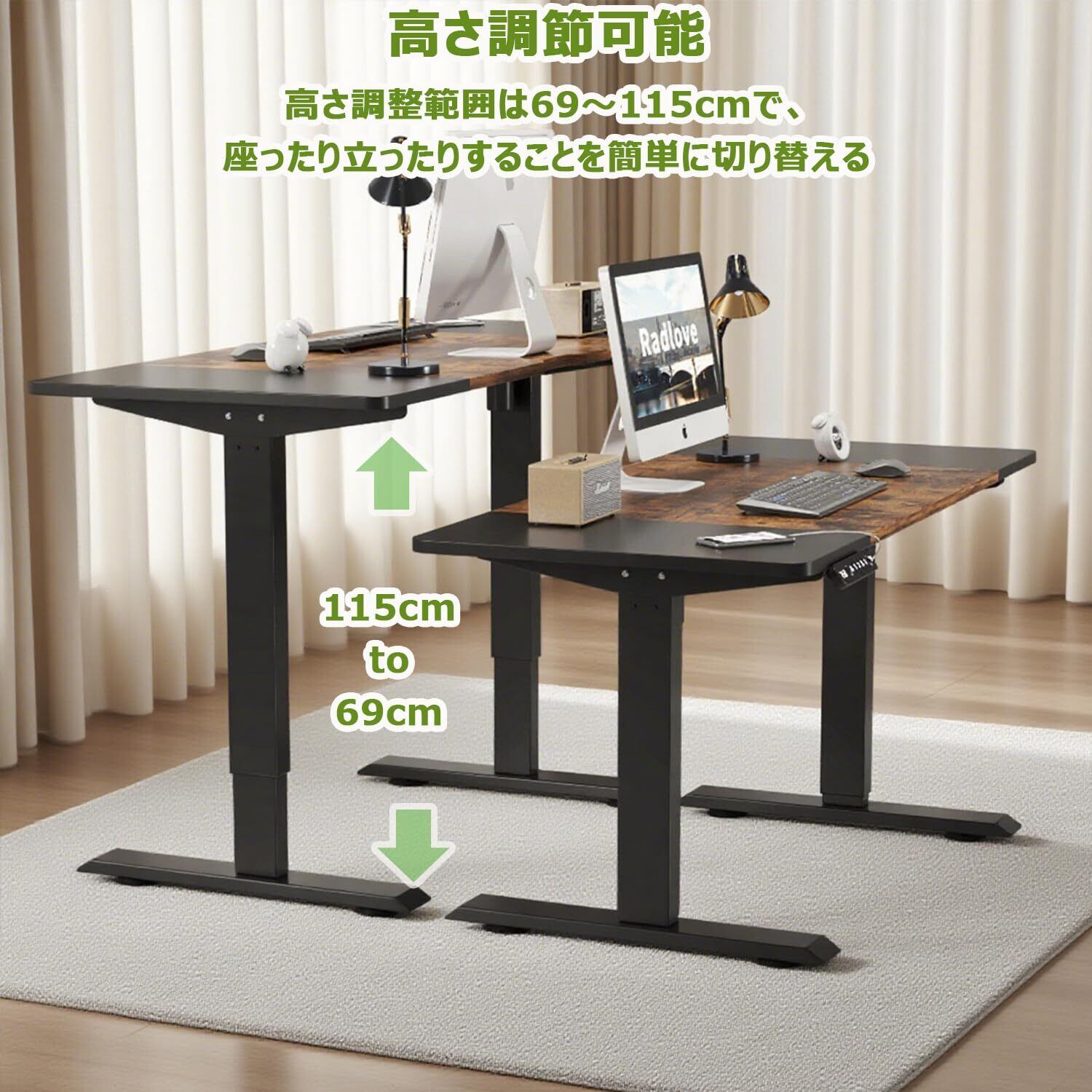 【電気で高さ調節 】この机は、「⮝・⮟」ボタンを押すと、座位から立位まで69cmから115cmの範囲で自由に設定できます。人間工学的な設計に適合しており、人によって身長のニーズに応じて、お希望の高さを調節します。