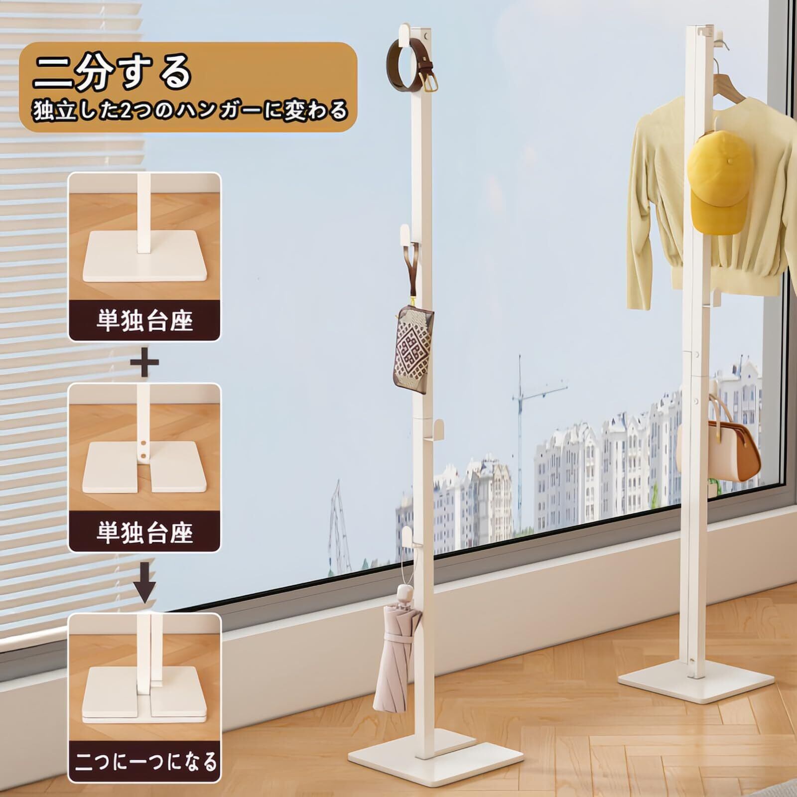 【1台で3役の大容量収納】:広げて服干し、収納してコートハンガーに。折り畳み室内物干しタワーを広げると洋服を干すスタンドとして使用でき、収納すると2个コートハンガーとして使えます。そのため、洋服を干す時以外にも、コートやバッグを掛けて収納するのに便利です。高さ160cmだから、ロングワンピース、バスタオル、シーツなど丈の長い洗濯物も床につかず、しっかり干せる抜群の設計です。