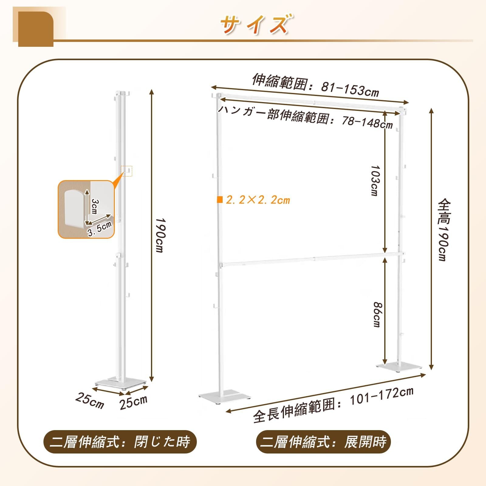 室内物干し 折り畳み 組み立て簡単 二段 横棒長さ自由調整 W101~172×D25×H190cm 洗濯物干し 室内物干しスタンド 物干し竿 ホワイト