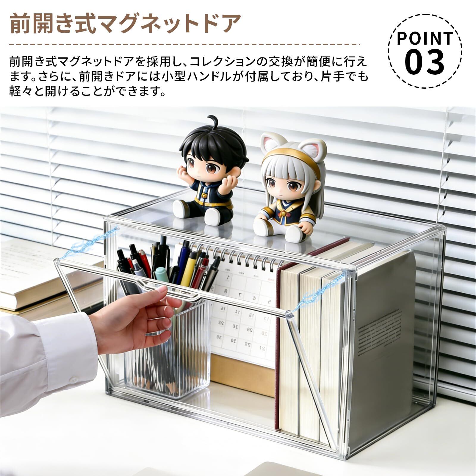 【多用途収納】フィギュアモデルだけでなく、バッグ、靴、ぬいぐるみ、本、コスメなど、様々な物品の収納に対応します。リビング、寝室、玄関、オフィスなど多様なシーンで使用可能で、簡単に整理整頓された空間を作り上げます