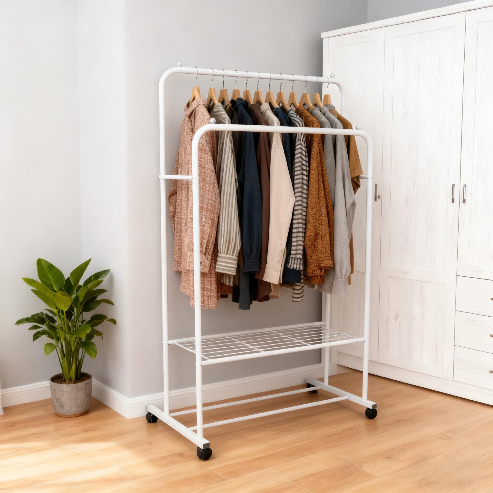Susire ハンガーラック おしゃれ 頑丈 洋服ラック 大容量 室内物干し 2段 パイプハンガー 衣装ラック 洋服掛け キャスター付き 棚付き ダブル 収納付き 白 幅80
