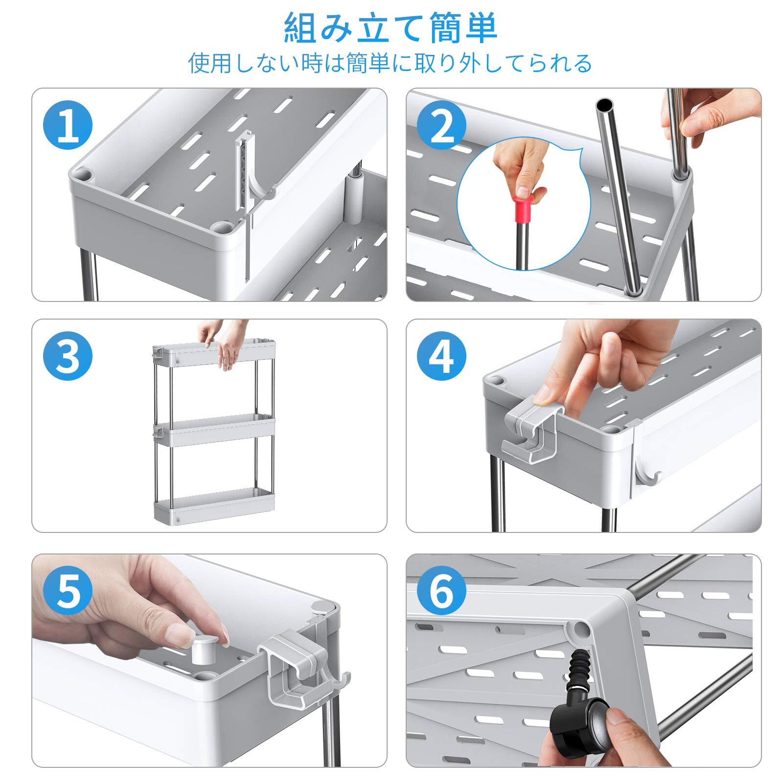 【組み立て簡単】このキッチンワゴンは組み立て簡単、女性一人でも組み立てられます。説明書に組み立て図解もあります。段数を自由に決めて、一段、二段、三段でも使えます。 説明書に組み立て図解もあります。