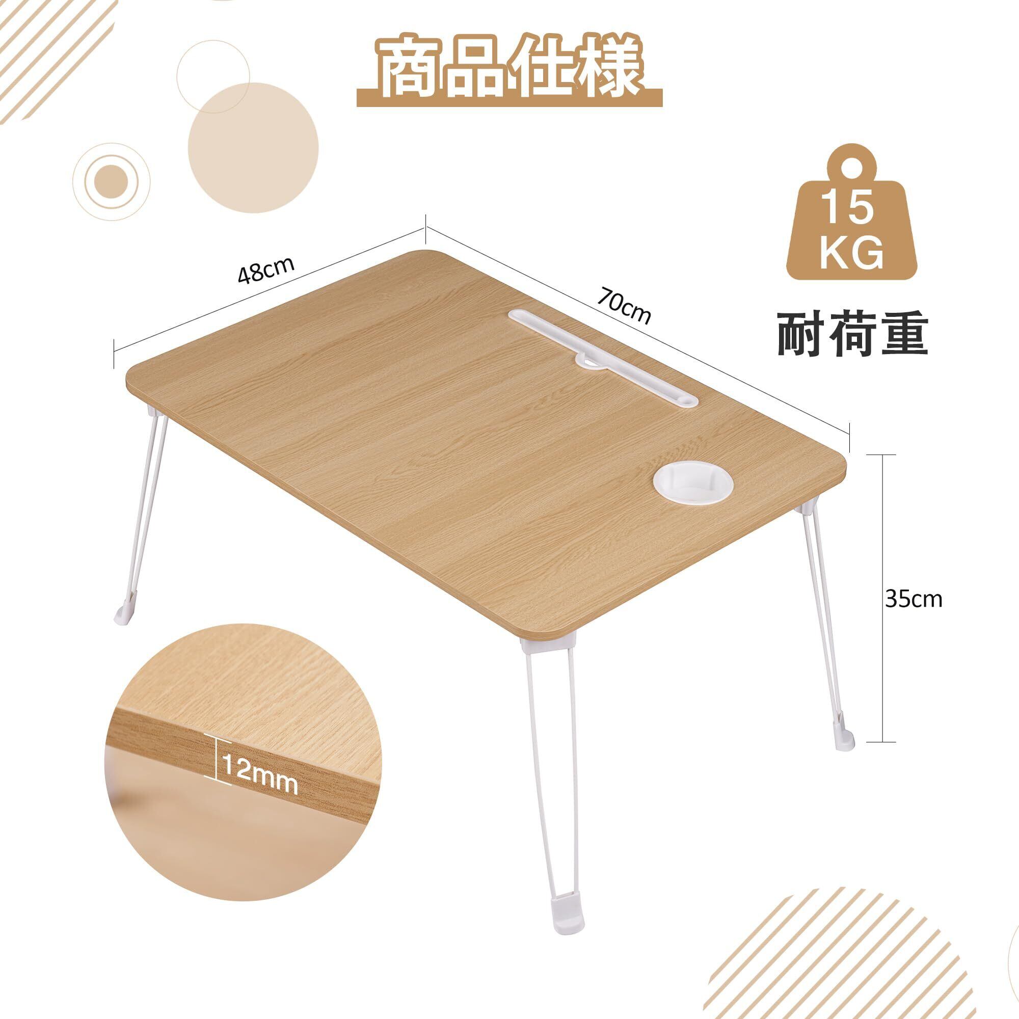 【製品仕様】(サイズ):幅70×奥行48×高さ35cm;折りたたんだ厚み:約5cm;(本体重量):3.1kg;(耐荷重):15kg;(材質):天板/HDF木製、脚部/スチール。※組み立て不要。届いたらすぐ使えます。