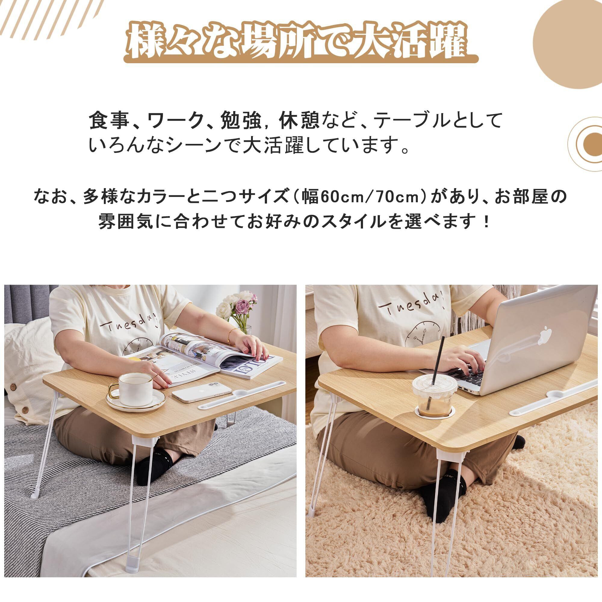 VECELO ローテーブル 折りたたみ式 ベッドテーブル 幅70×奥行48×高さ35cm カップスロット 凹溝付き 多機能 隙間収納 組立不要 簡易式 軽量 一人暮らし ソファ メープル