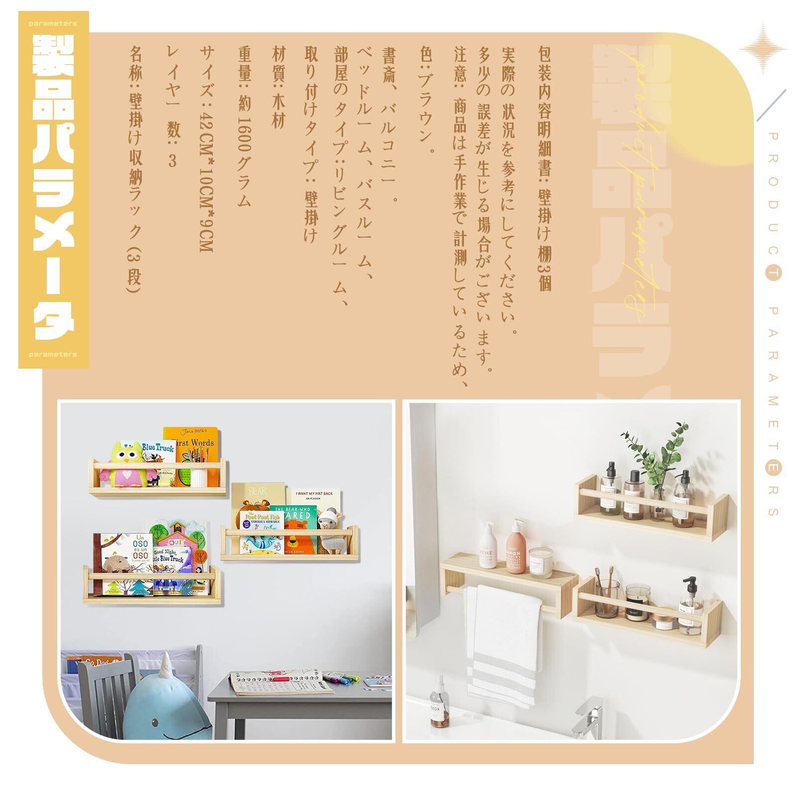 【多層収納】:このセットには三つの壁掛け棚が含まれており、個別に使用することも、組み合わせて利用することもできます。リビング、書斎、浴室、寝室などに適しています。浮き棚のサイズは42cm×10cmで、大きな収納スペースがあり、花瓶、絵本、おもちゃ、記念品、アルバム、バス用品などを収納できます。