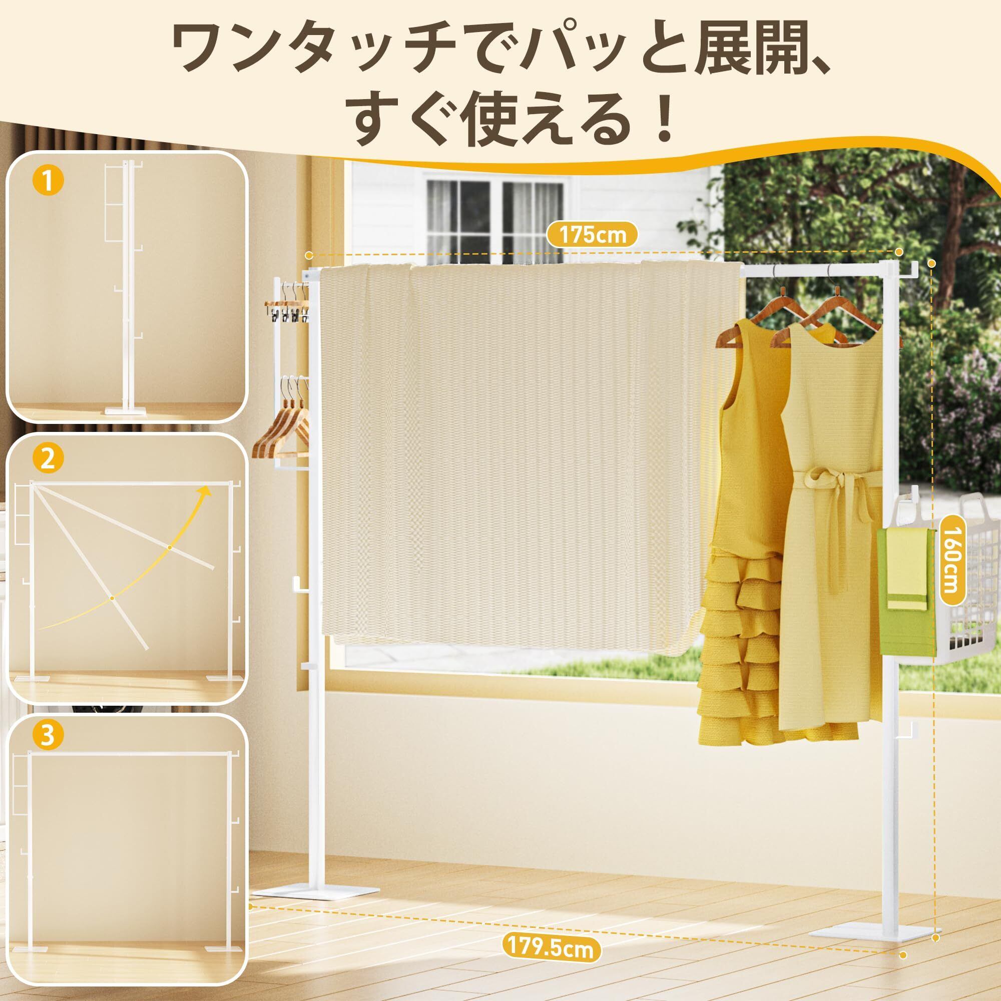 簡単収納&絶妙サイズ設計:一人でも5秒で簡単に展開・収納でき、出しっぱなしでも生活感が出にくいデザインなので、急な来客時も安心です。女性やご年配の方、一人暮らしの方でも、片手で簡単に操作できる折りたたみ物干しスタンドです