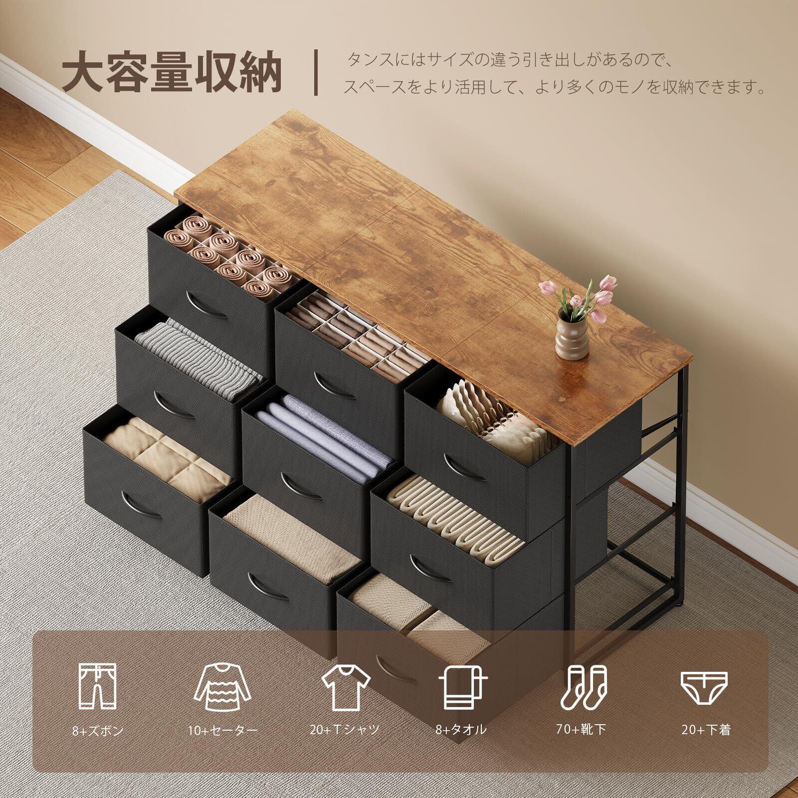【大容量の収納】:各23Lの布製引き出しを9段備え、合計207Lの超大容量。衣類(約180着のTシャツ分)はもちろん、おもちゃ、本、雑貨など、家中のあらゆる物をスッキリ収納。それぞれの引き出しは6kgまで耐えるから、安心してたっぷり収納できます。MDFボードを内蔵した布製の引き出しは重い物を収納しても型崩れしにくい。通気性に優れ、ほこりの侵入を防ぎ、プライバシーを保護することができる。大容量を持ち、衣類、書類、バッグ、化粧品、おもちゃなど、多種類のアイテムを効率的に収納できる。
