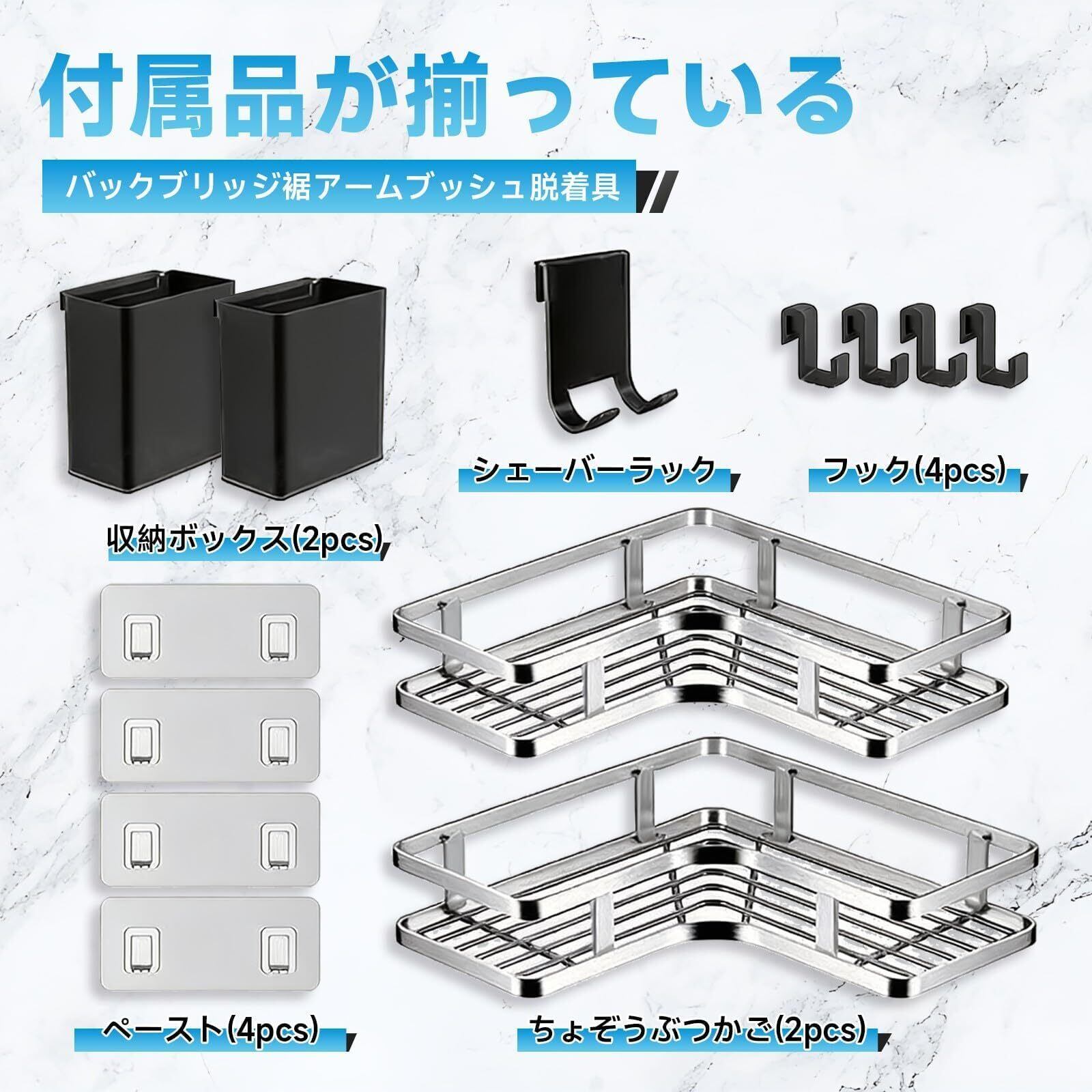 ダブルストレージラック、歯ブラシスタンド×2、シェーバーラック×1、フック×4、強力接着パッド×4の組み合わせで、隅々まで有効活用。洗面所やキッチンの限られたスペースでも、あらゆる小物を整理整頓できます。