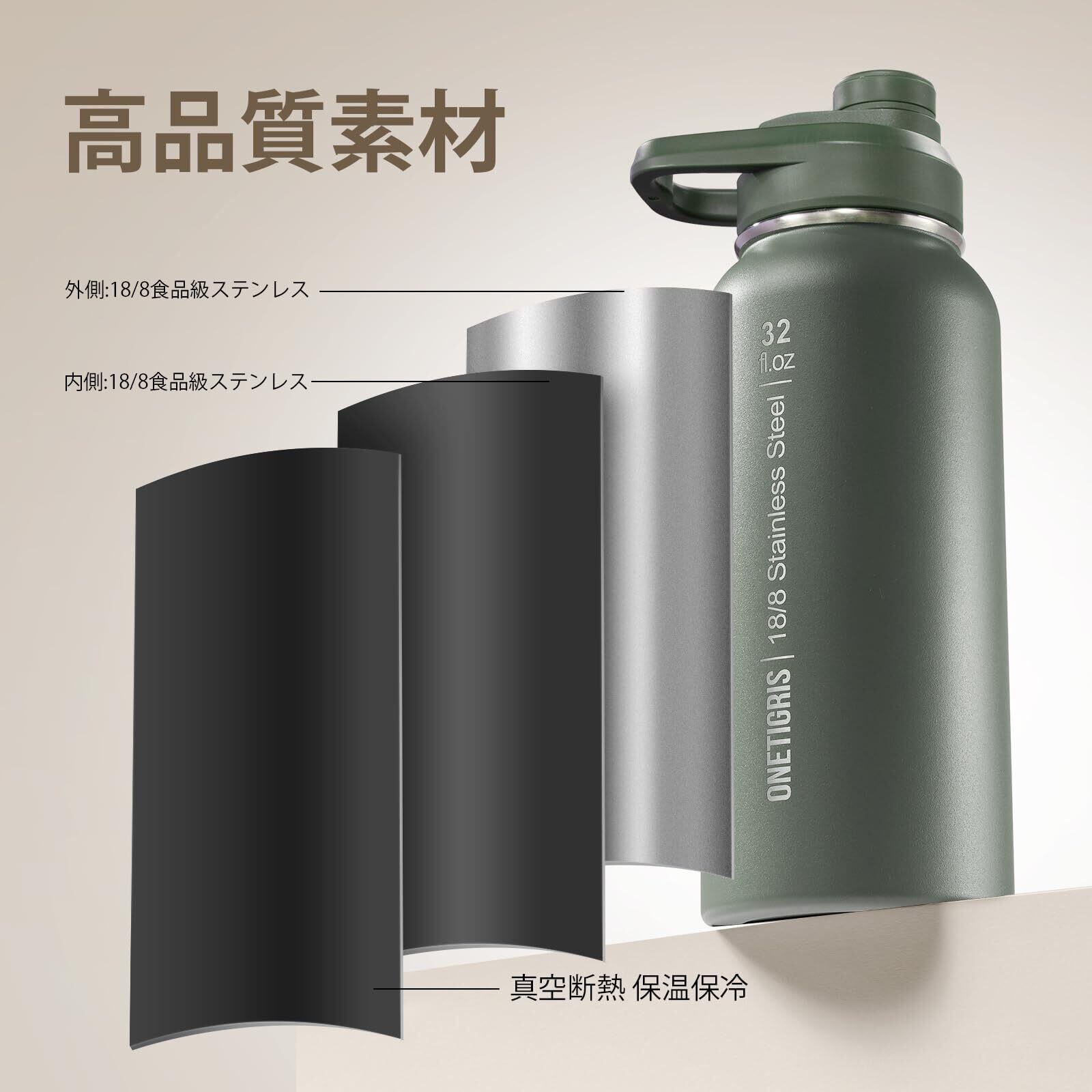 OneTigris 水筒 1リットル ステンレスボトル セット 水筒カバー付き 真空断熱 保温保冷 3X交換蓋 2Xストロー 1Xブラシ 広口 洗いやすい 水漏れ防止 ミリタリー風 アウトドア スポーツ、ジム、キャンプ、ハイキング、通学、通勤 適用 グリーン