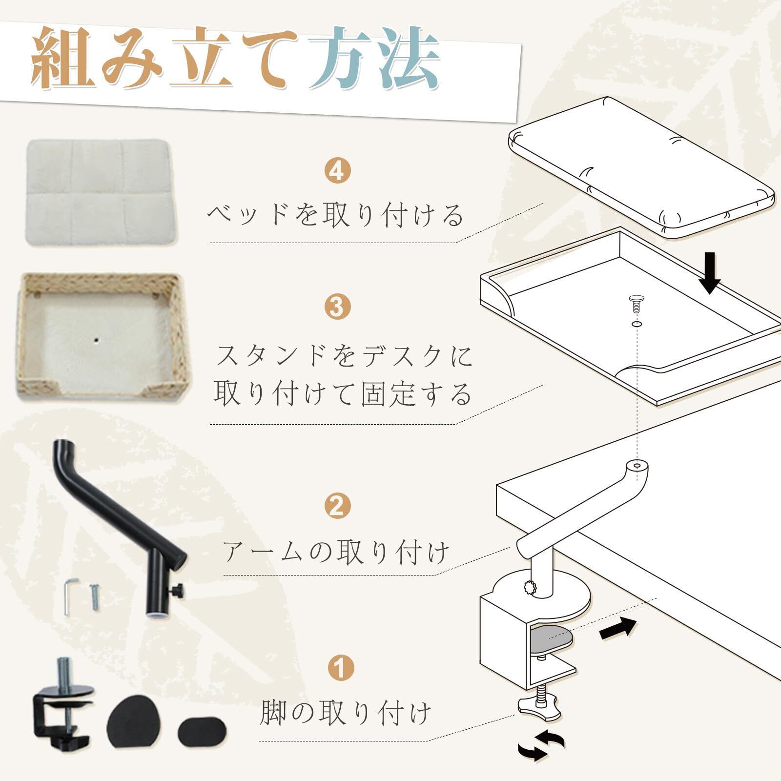 【商品仕様】ベッドサイズ:幅41×奥行31×高さ8cm、スタンド:高さ30cm、耐荷重20kg。対応可能なデスク天板の厚さは5cm以内になります。梱包に工具付属、デスクに穴あけ不要です。※大切な室内猫用の安全のために、ガラス天板や薄型天板にはご利用はお控えください。