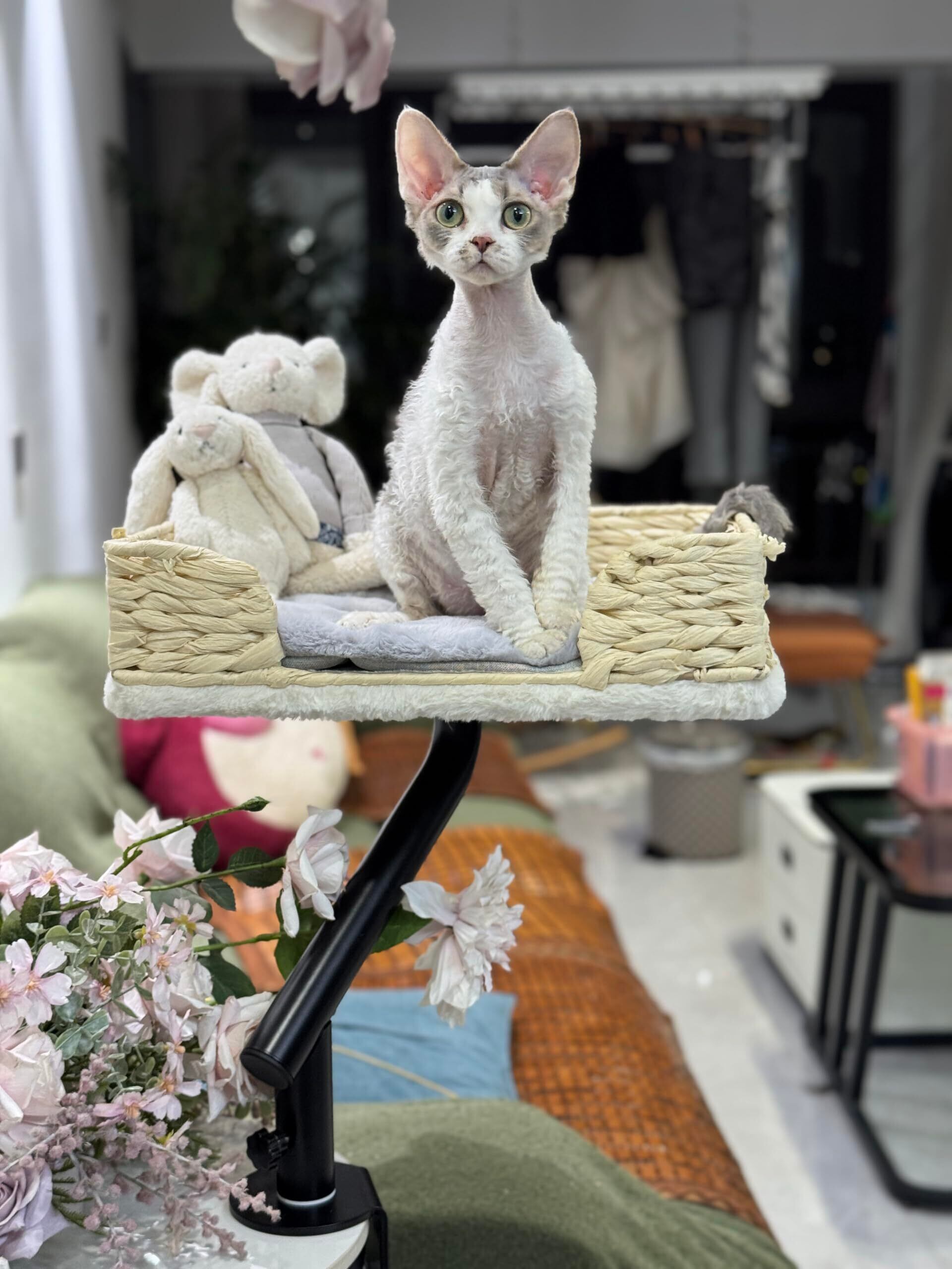 PAWZ Road デスク用 猫ベッド 卓上ペットベッド 耐荷重20kg キャットベッド 小動物 猫ハンモック 360°回転 卓上収納 棚 物置台 展示台 頑丈 室内 省スペース 取り付けが簡単 ふわふわ マット付き 洗える シンプル おしゃれ - ナチュラルな素材— 高さ30cm