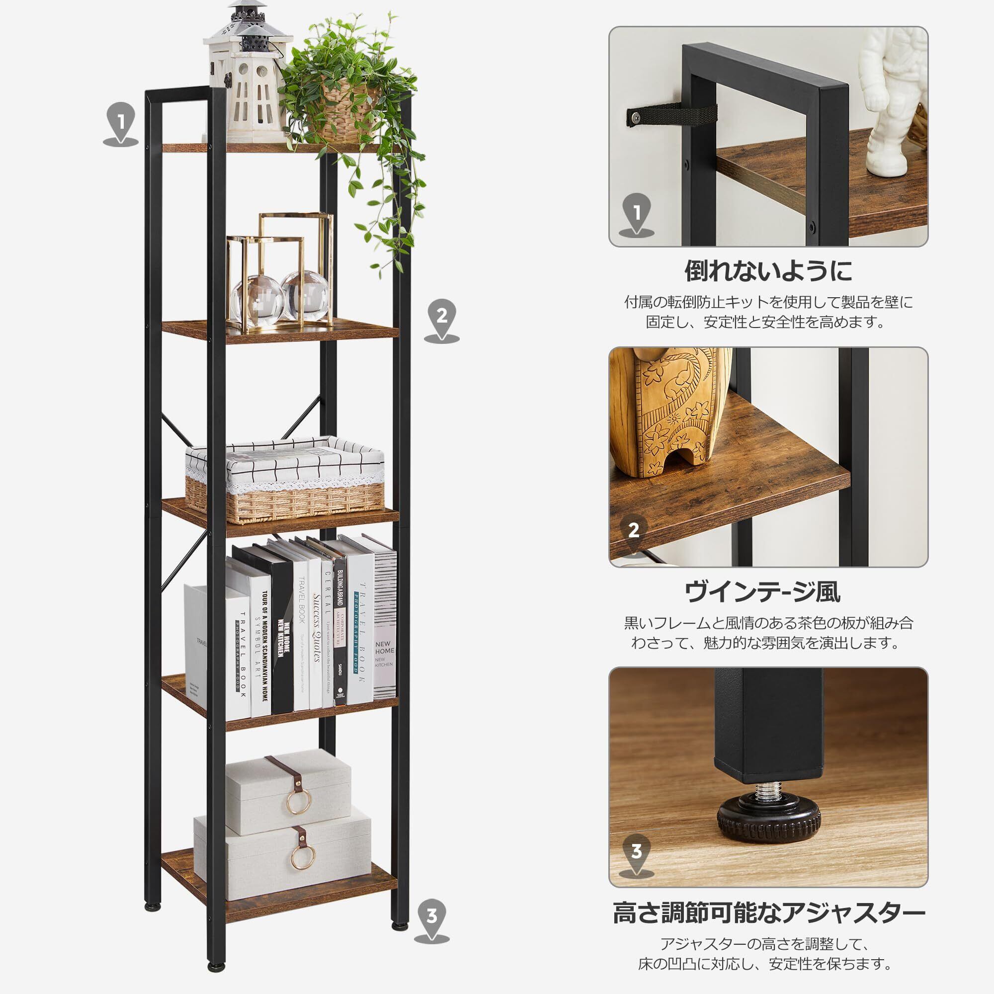 VASAGLE オープンラック 本棚 棚 ラック5段 収納ラック オープンシェルフ スリム スチールラック 収納棚 整理棚 すき間収納 シェルフ 薄型 花台 北欧 おしゃれ 木製 五段 幅39.6x奥行30x高さ154CM 組立簡単 LLS100B01