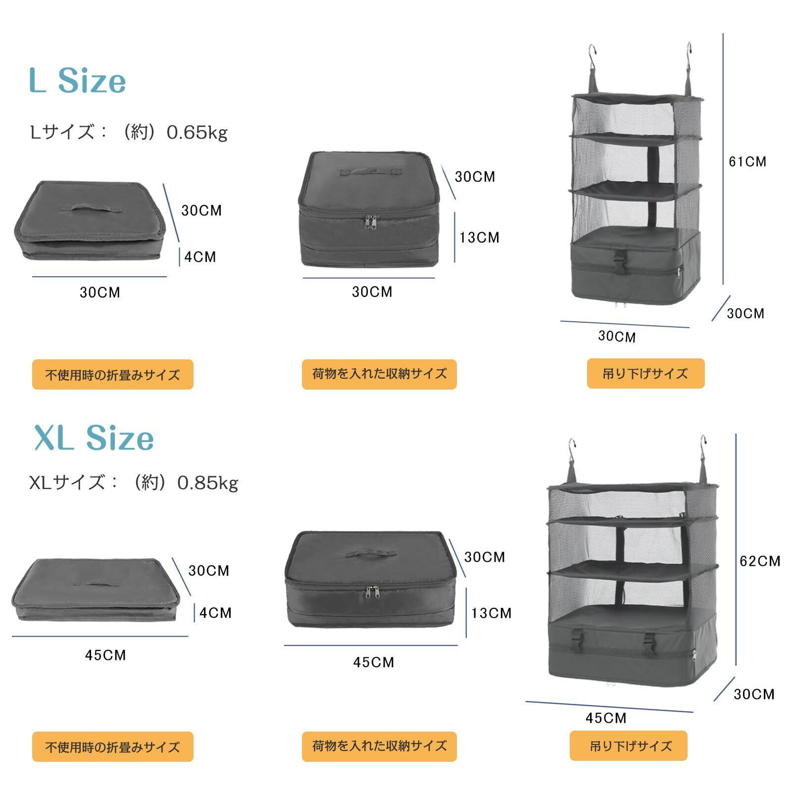 【素材】ポリエステル 【カラー】ブラック ブルー グレー ローズ カチオングレー 【吊り下げサイズ】Lサイズ:30*30*61CM XLサイズ:45*30*62CM 【荷物を入れた収納サイズ】Lサイズ:30*30*13CM XLサイズ:45*30*13CM 【不使用時の折畳みサイズ】Lサイズ:30*30*4CM XLサイズ:45*30*4CM