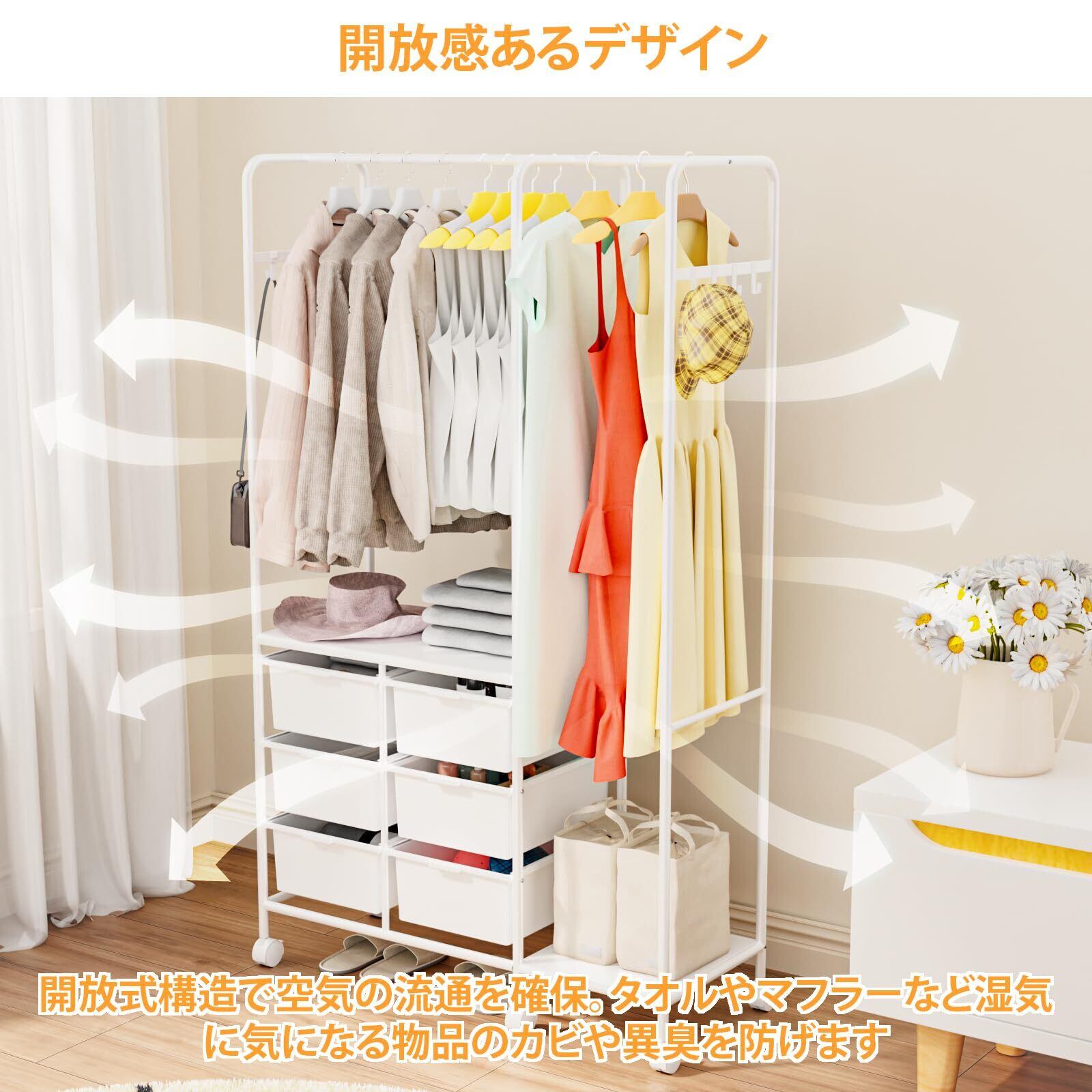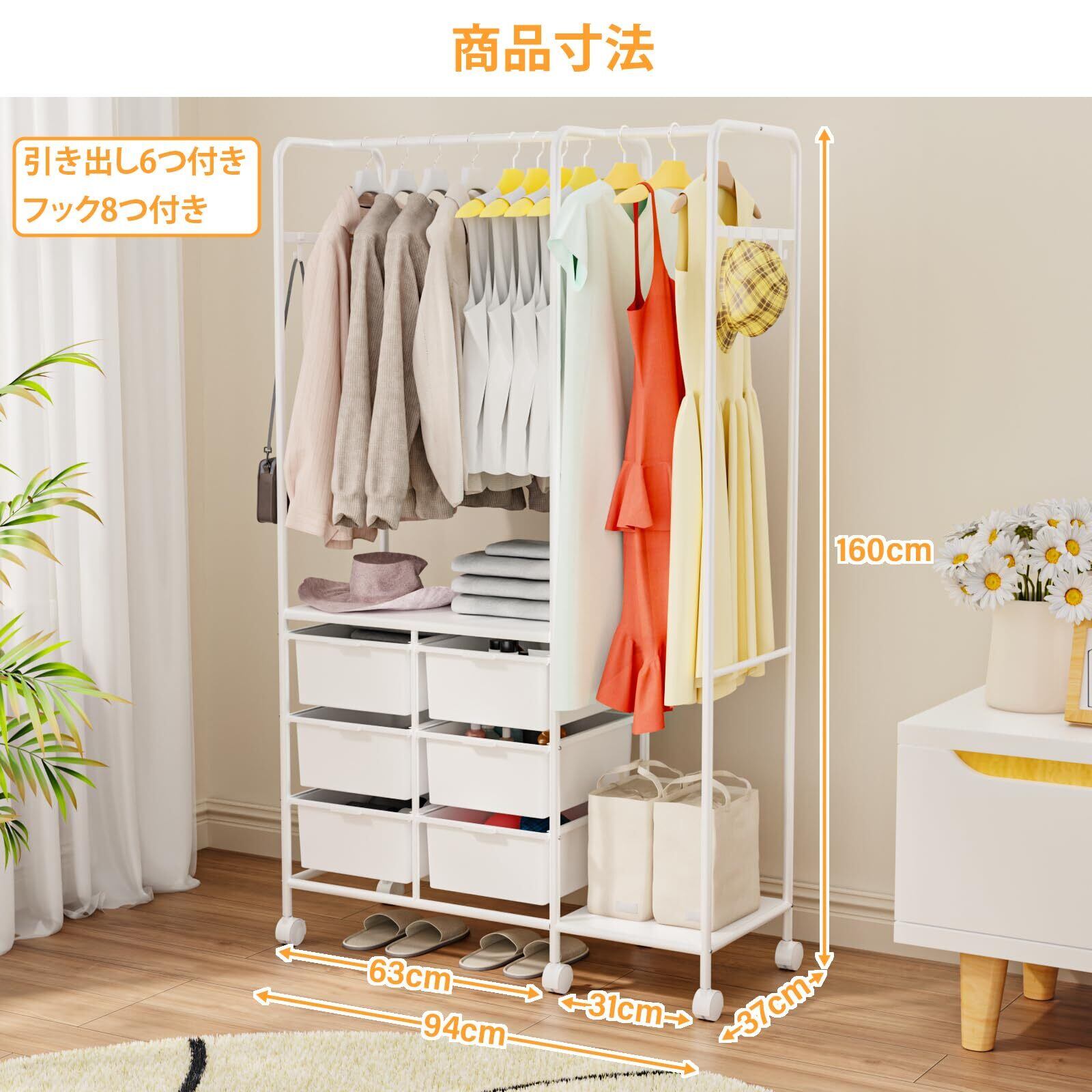 ハンガーラック 洋服ラック 収納棚 引き出し付き 棚付き ワードローブ おしゃれ 洋服 衣装 収納 キャスター付き 移動式 洋服掛け コート掛け コンパクト 大容量 省スペース 頑丈 メタル クローゼット 94×37×160cm (ホワイト)