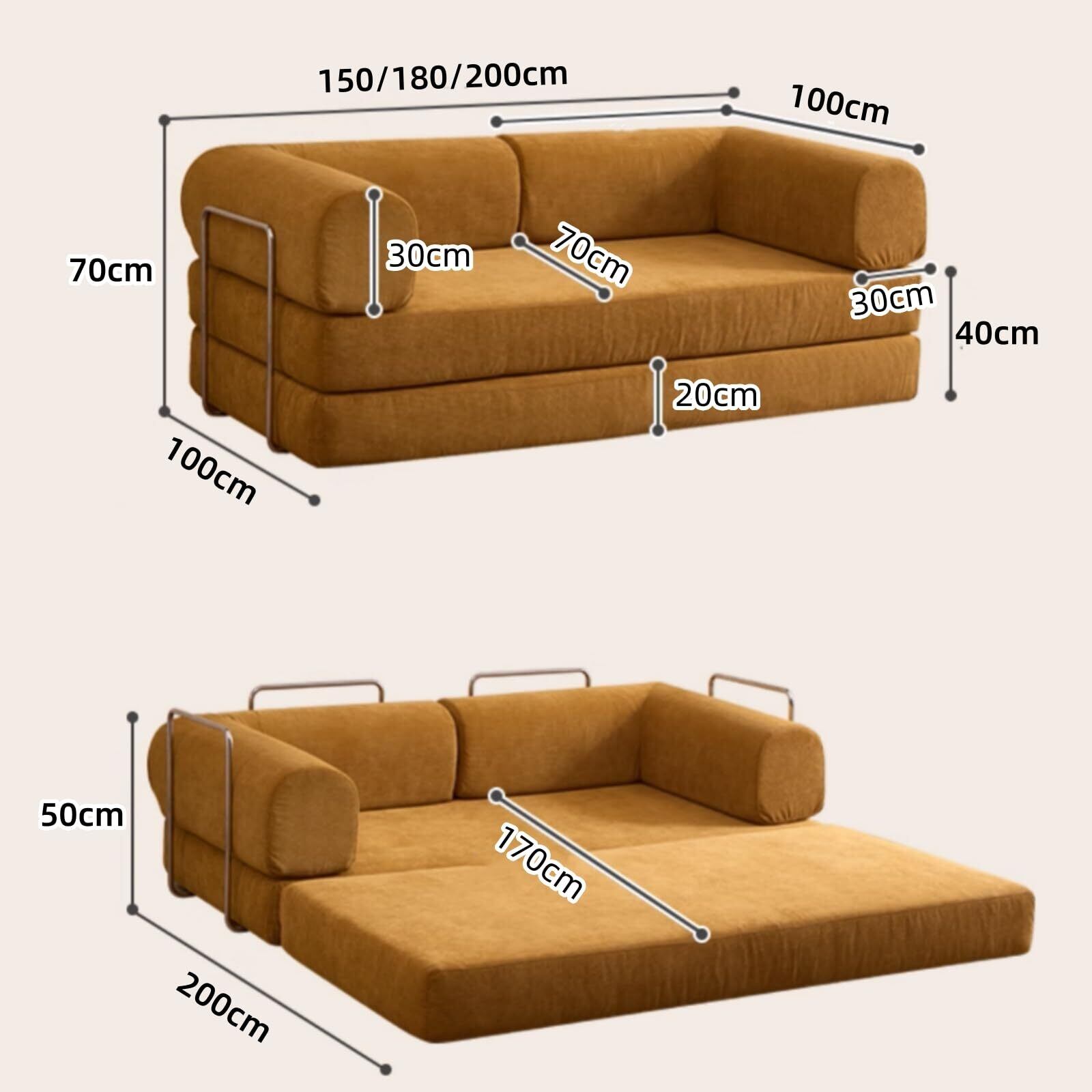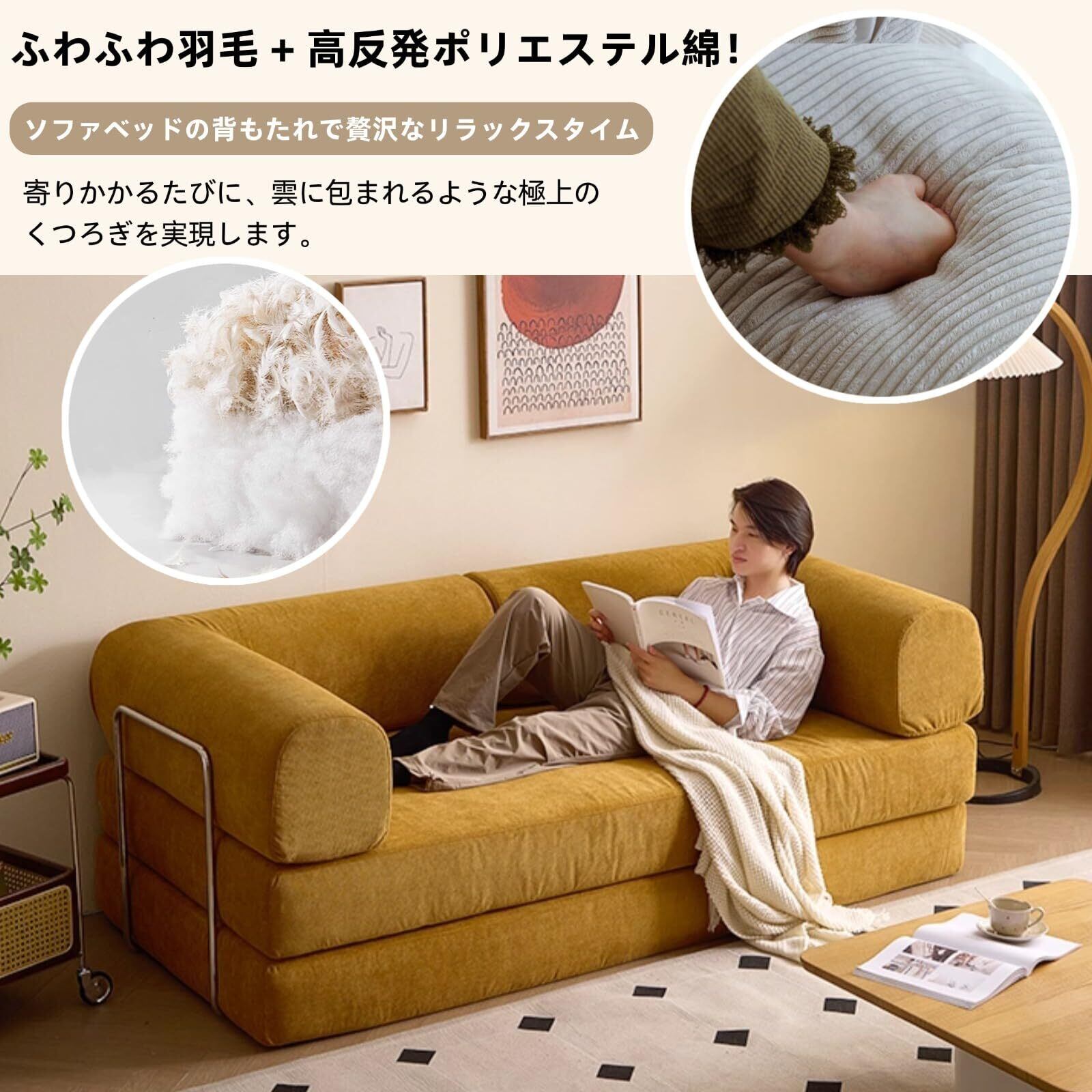 ソファベッド ソファーベッド カウチソファ 2人掛け 折りたたみベッド フロアソファ ローソファ 高反発ウレタン 寝る 座る 完成品 圧縮梱包 おしゃれ セミダブル シングル 一人暮らし 来客用 (イエロー,幅200cm)