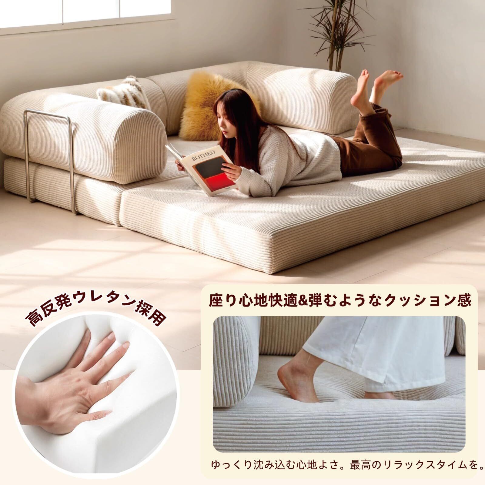 【沈みにくく、柔らかく包み込む座り心地】座面には高反発スポンジを厚く充填!適度な弾力が体の荷重を均一に分散し、長時間座っても臀部や腰部が沈みにくく、姿勢を安定させてくれます。ベッドとして展開した際も、クッションの柔らかさが体を支え、快適な休憩に役立ちます。