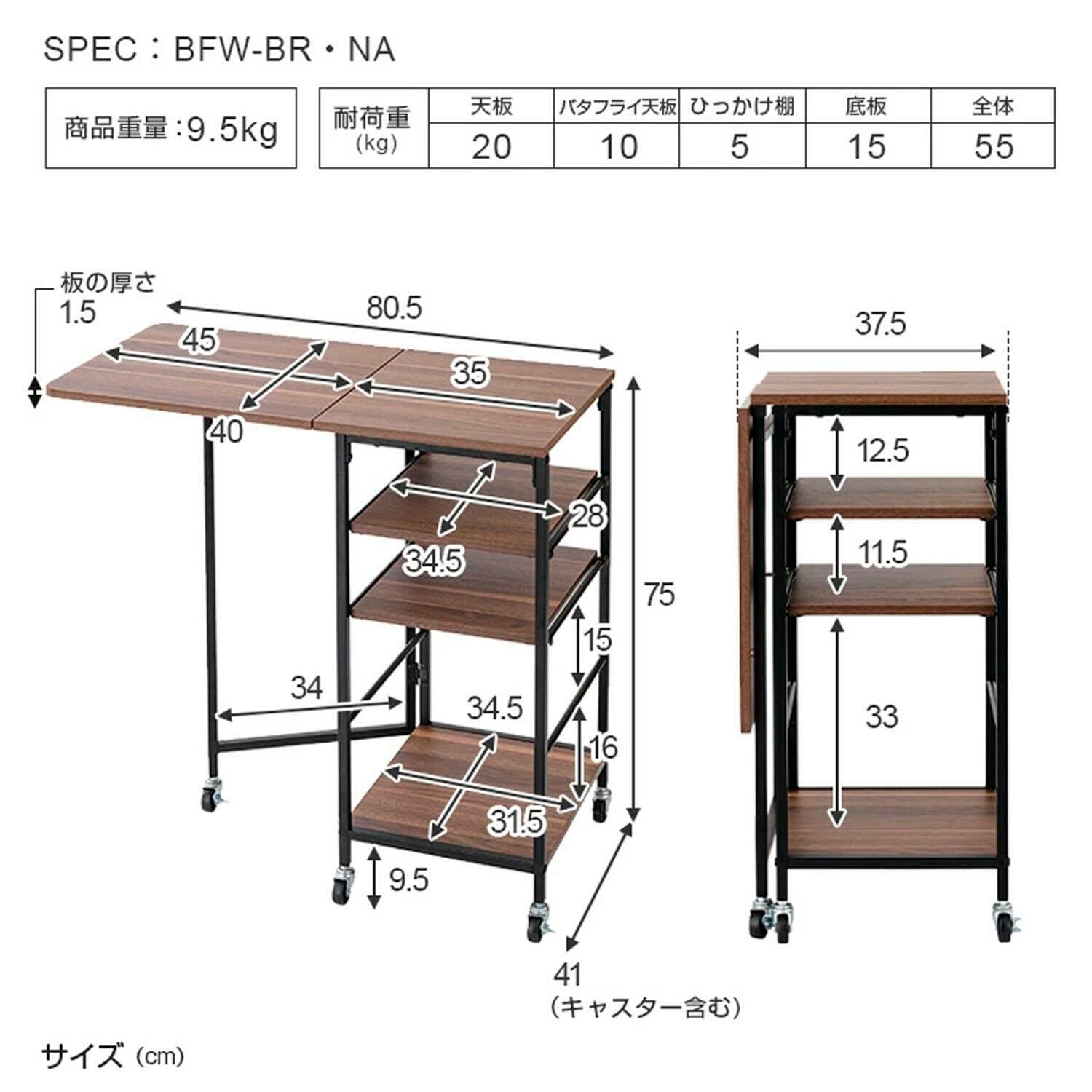 耐荷重 天板:20kg、バタフライ天板:10kg、ひっかけ棚:5kg、底板:15kg、全体:55kg *耐荷重は、均等荷重をかけた場合の測定値であり、する値ではありません。