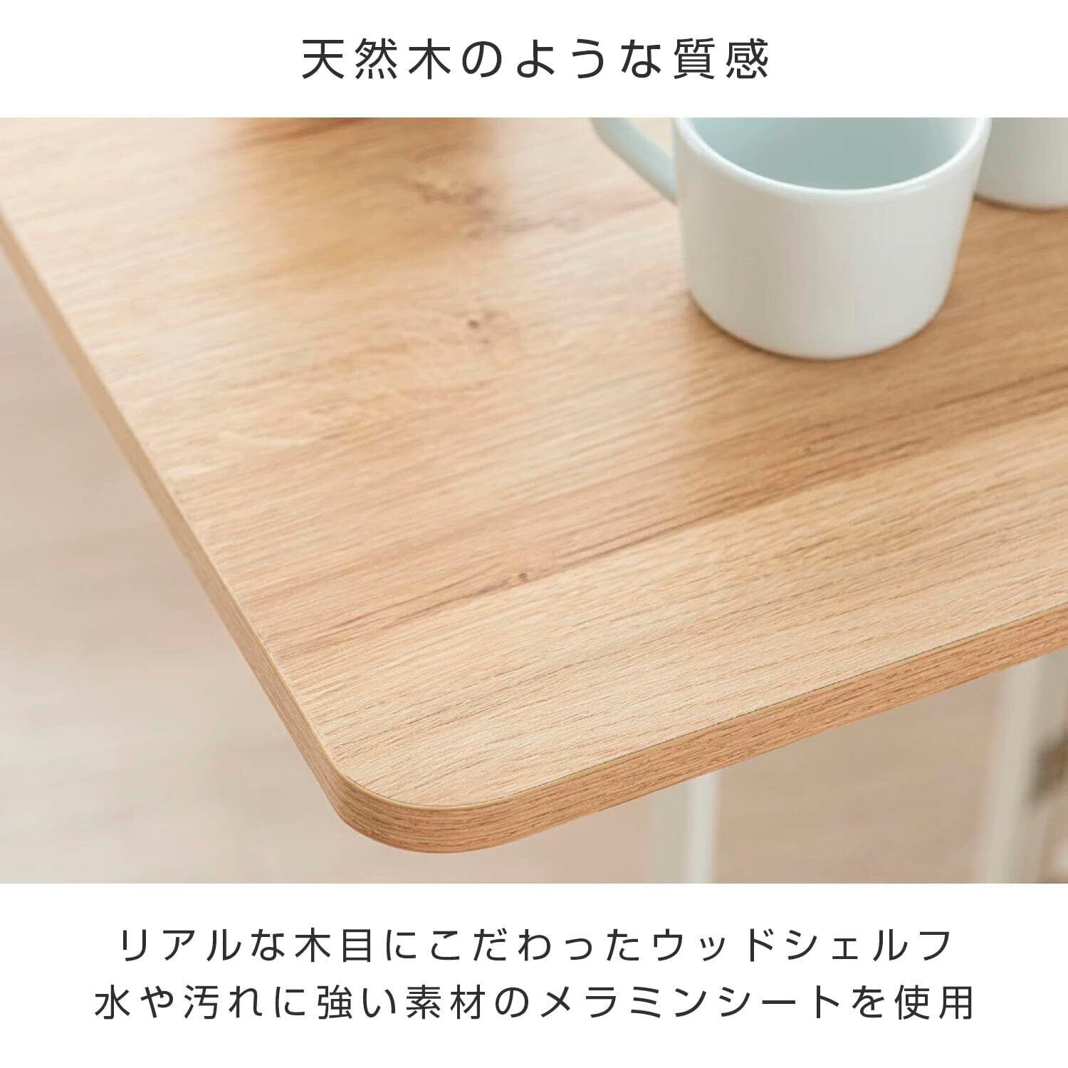 シェルフ・フレームはどちらも水や汚れに強い素材を使用しており、天板はメラミン樹脂加工でお手入れも簡単。