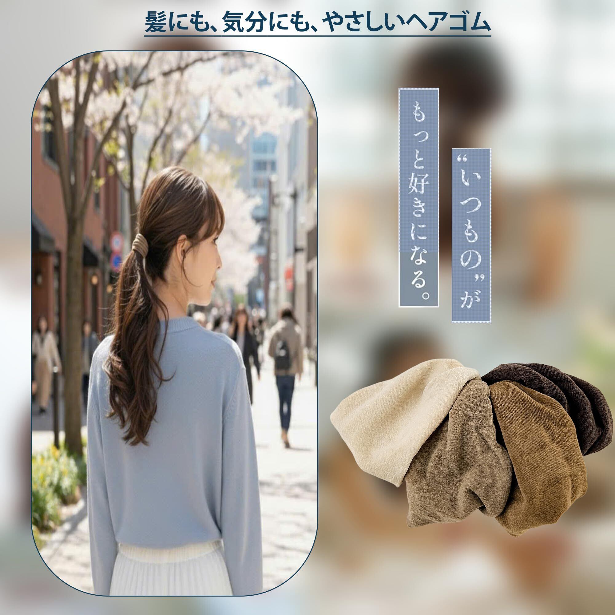 【商品仕様】素材:ナイロン/内部ラバー。セット内容:4本。重量:約3g/本。寸法:外径約5.5cm。柔らかく太めの設計で、日常使いに適した実用的なサイズ感です。髪ゴムとしてはもちろん、手首アクセサリーとしても使用できる便利な仕様になっています