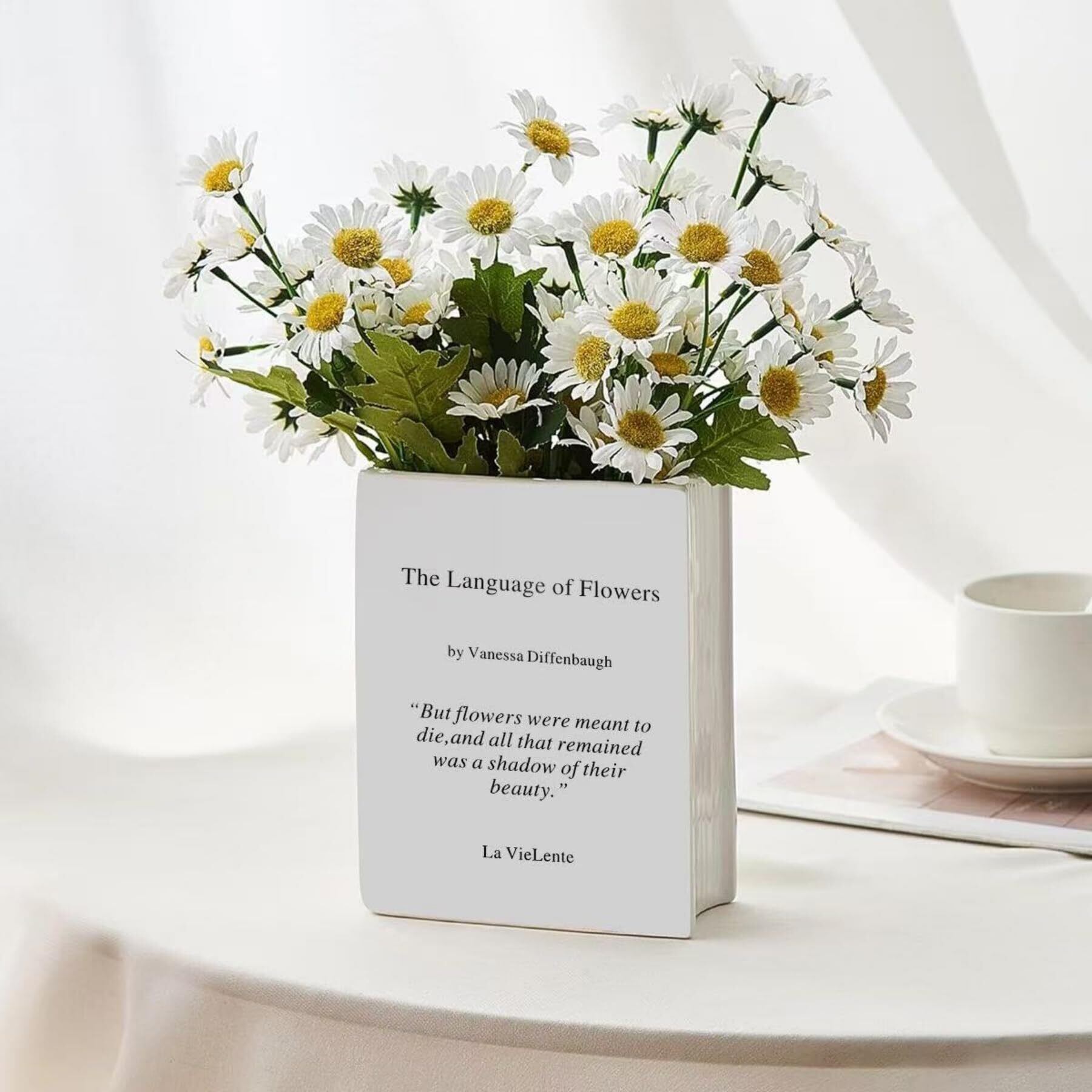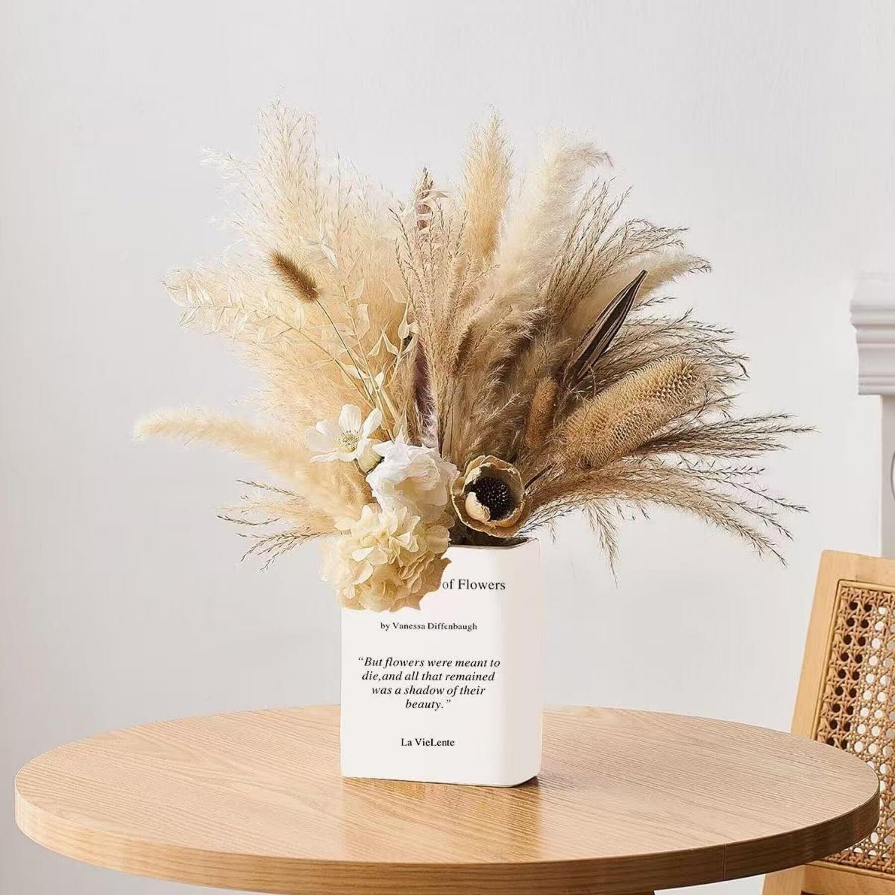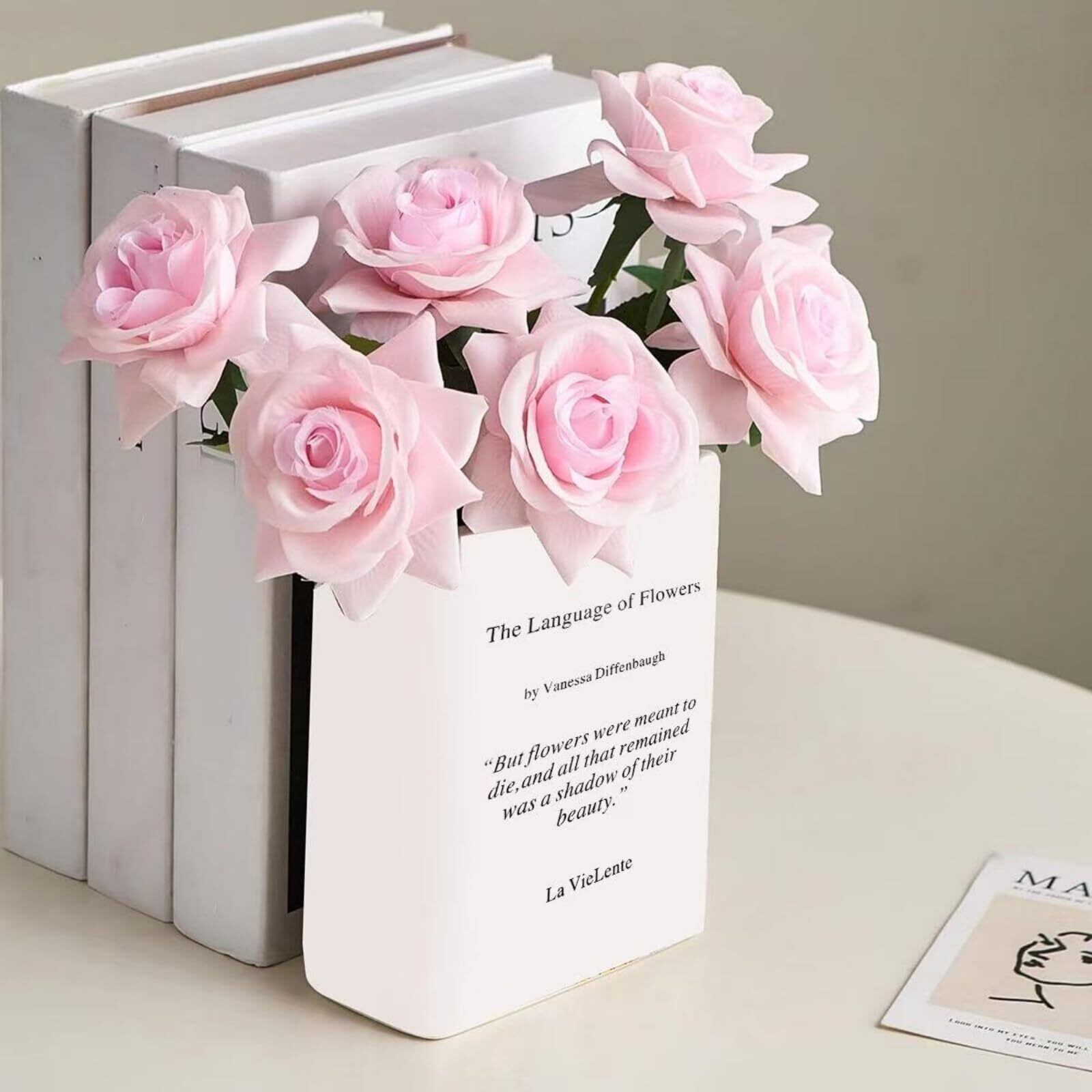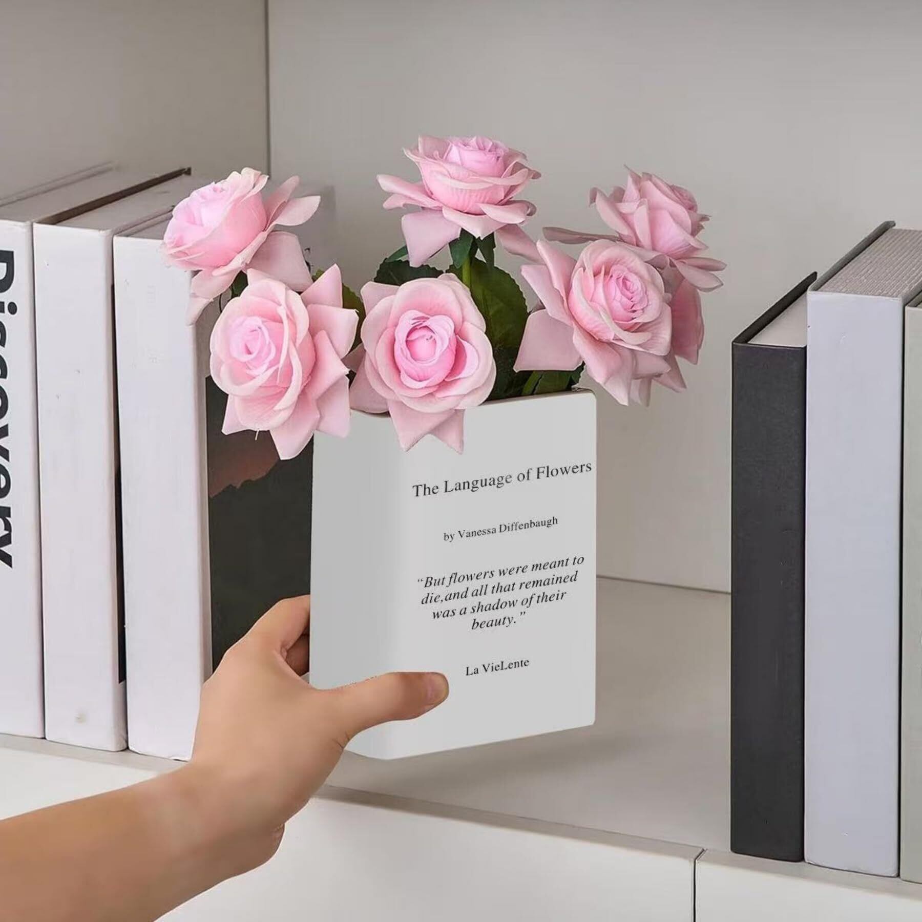 1.独創デザイン:本花瓶は本をモチーフにデザインされており、文芸的な雰囲気と実用性を完璧に融合しています。瓶身に印刷された文字はアート感を高め、本棚に飾っても、机の上に置いても、空間の目玉になります。