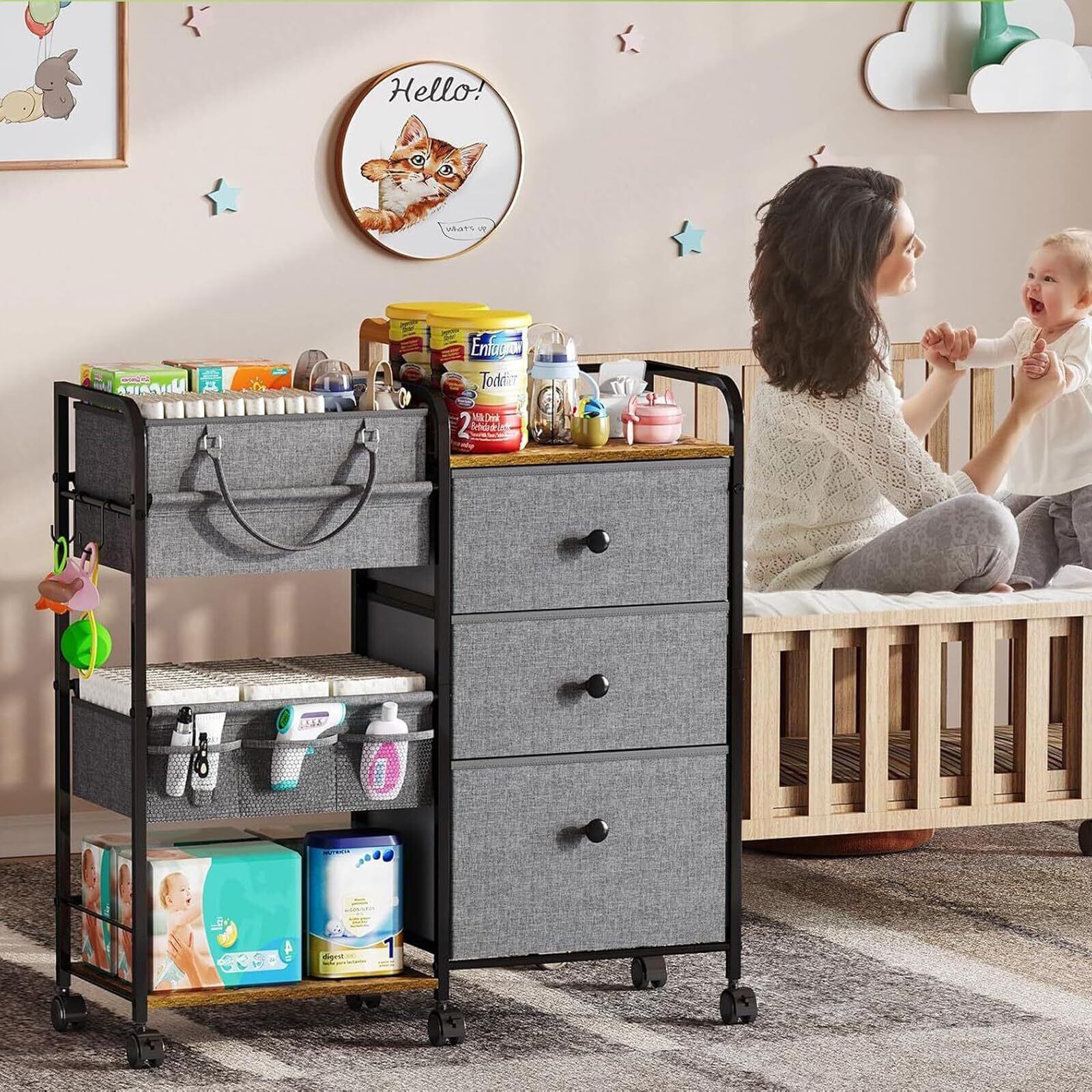 多機能設計: 3段の引き出し、2段の棚、仕切り付き収納バスケット、取り外し可能な持ち運びバスケットを備えた、赤ちゃん用品の収納に最適なワゴン