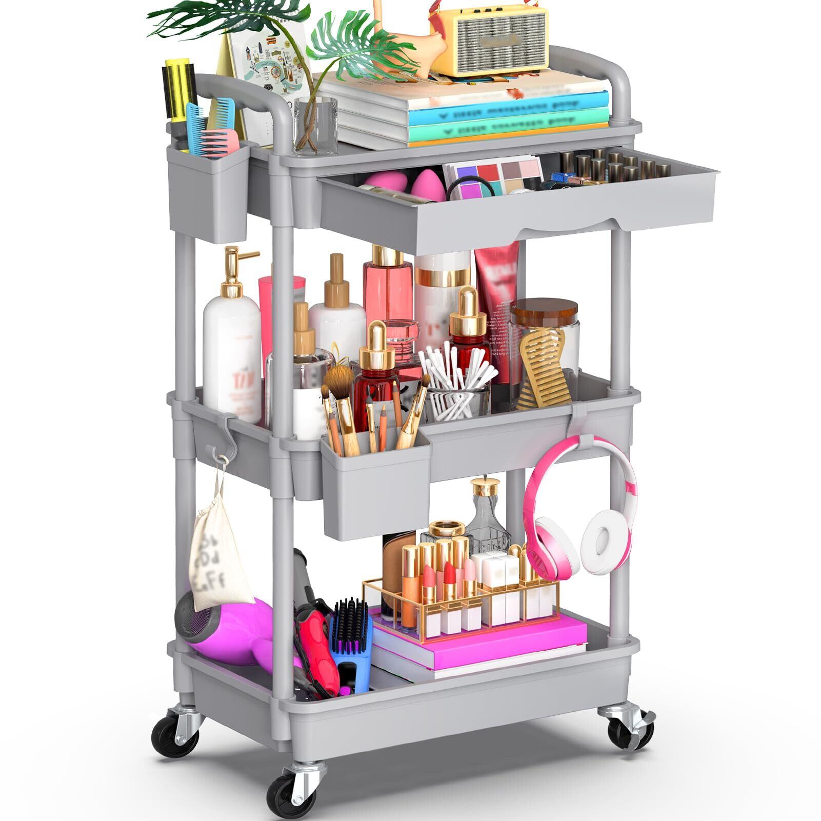 Goovilla キッチンワゴン ローリング 3段 引き出し付き ハンドル付き 収納カップ 仕切板付き 多機能 小物 隙間収納 バスケットラック バスルーム オフィス キッチン用 収納ワゴン 幅37.8×奥行26.9×高さ75.9cm グレイ