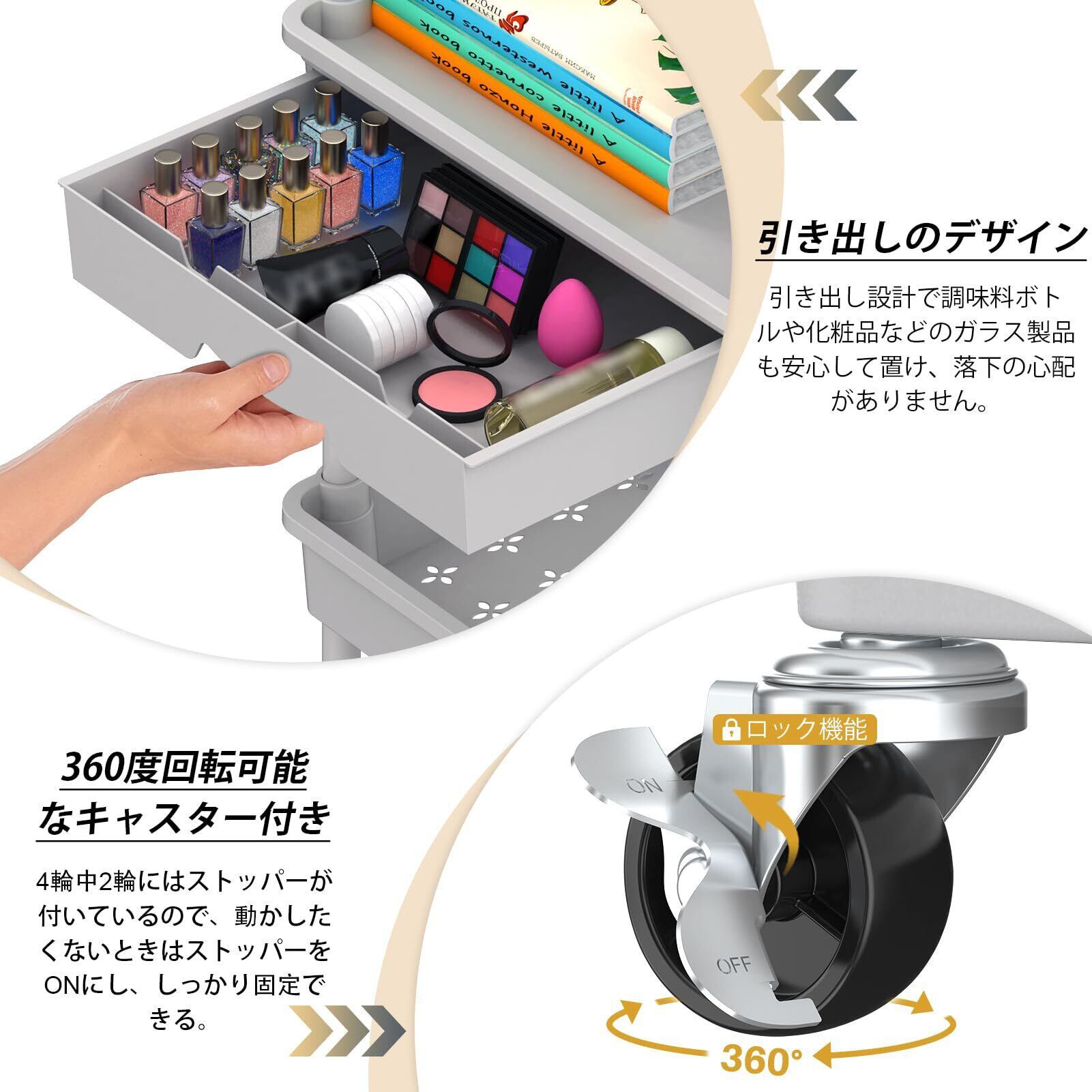 【組立簡単】シンプルで組み立てやすい、工具不要で、女性一人でも組み立てられます。また、ローリングカートは、さまざまな用途に基づいてさまざまな層から調整できます。