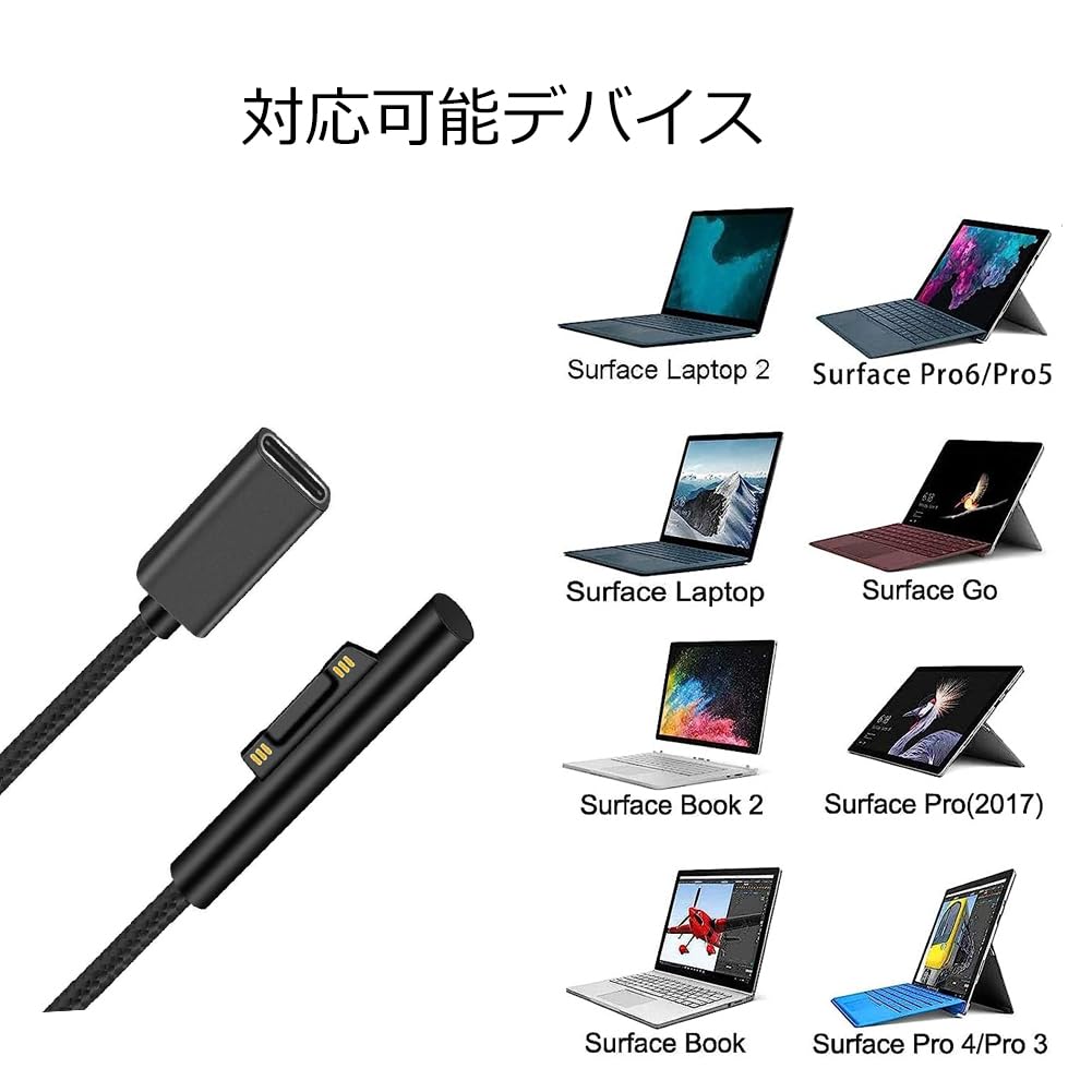 【surface充電ケーブル対応機種】Microsoft Surface pro 3/4/5/6/7/7+ 、Surface Laptop1/2/3/4、Sruface Book1/2/3、Surface Go1/2/3。Surface Pro 8/9 Surface Laptop SurfaceBook等用 PD USB-C サーフェス 充電ケーブル