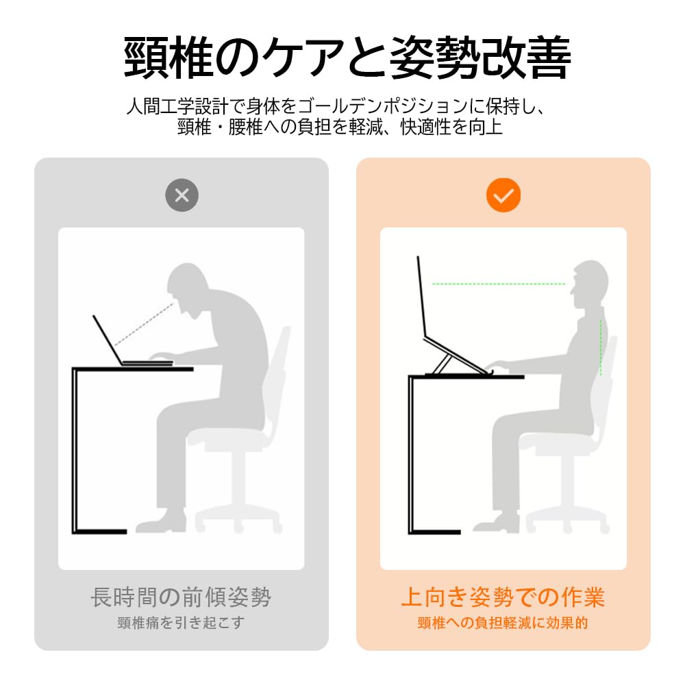 【10段階高さ調節&快適な視角調整】 ノートパソコンスタンドは、高さを3.5cm~15.5cmの10段階で自由に調節可能。さらに、傾斜角度を10°~45°の範囲で細かく調整できるため、最適な視角を簡単に見つけられます。姿勢の改善や肩こり・腰痛の軽減に効果的で、長時間の作業でも疲れにくい設計です。自宅やオフィスでの作業効率を向上させます。