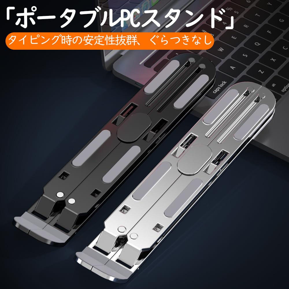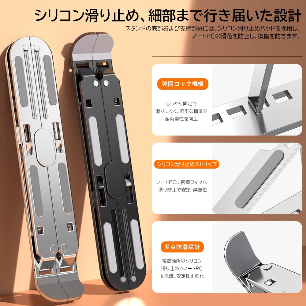 【優れた安定性&滑り止め設計】 スタンドの上面と底面には高摩擦力のシリコンパッドを配置。ノートパソコンがズレる心配なく、安定した作業環境を提供します。さらに、三角形の構造と強化合金素材により、耐久性と安定性を両立。どんなデスクでもしっかりと固定されます。※水気のある場所や不安定な台での使用は避けてください。