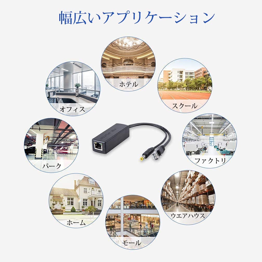 【仕様】POE出力電力:15.4W(12V / 1A),隔離電圧:1500V,POEパワーピン:(1,2)+ /(3,6)-と(4,5)+ /(7,8)-にオートネゴシエーション,データ出力ポート:データ(1,2)/(3,6),電源出力ポート:5521DCオス(5.5 * 2.1mm)