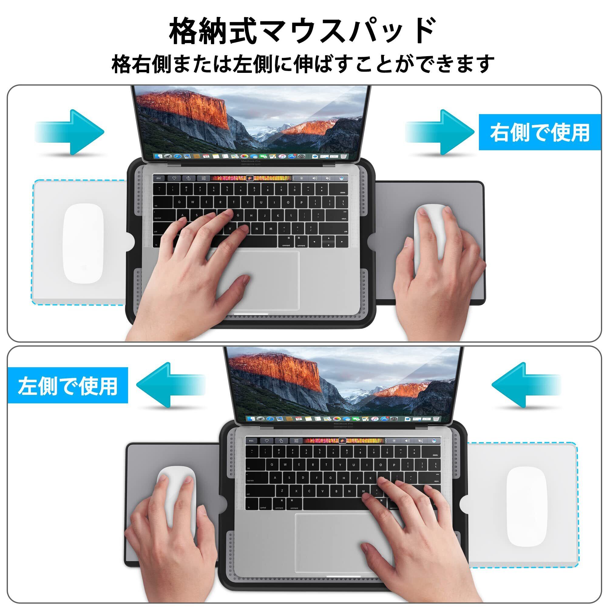 特徴 15.6インチまでのラップトップに対応, アンチスリップストリップ, マウスパッド内蔵, 熱保護機能, 軽量で持ち運びやすい