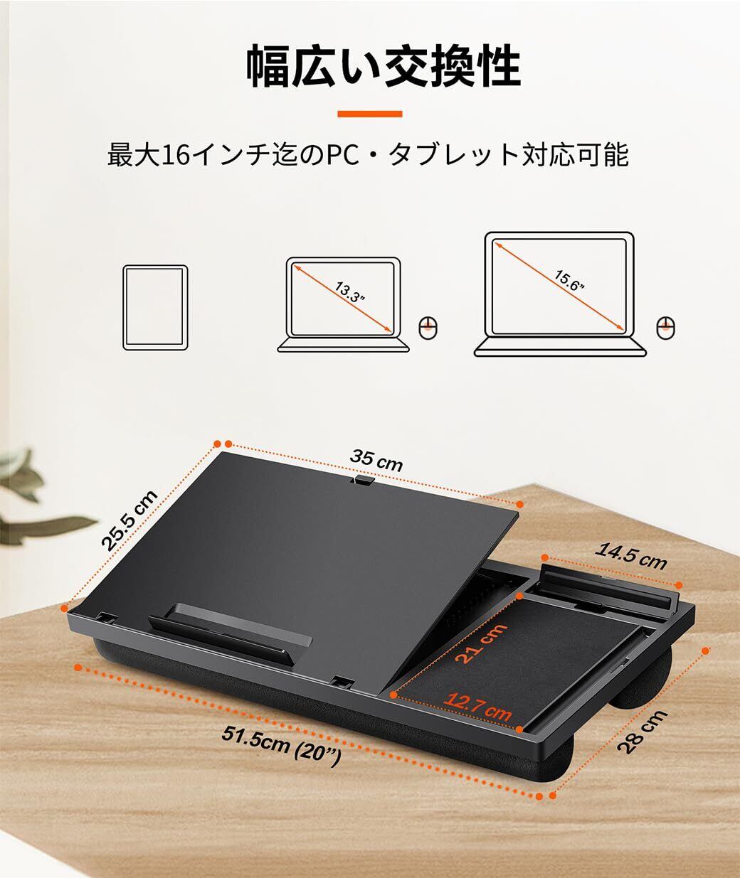【デスクと膝上両方使える】: デスクから離れ、ソファやベッドの上で仕事をしたい時に使いやすい「神器」です。PC/タブレットを天板に乗せて、必要に応じてマウス、スマホ、ペンがすぐ取れるように天板のプリセットされた場所に置くことができます。これによって、デスク作業に負けない効率的に仕事をすることができます。