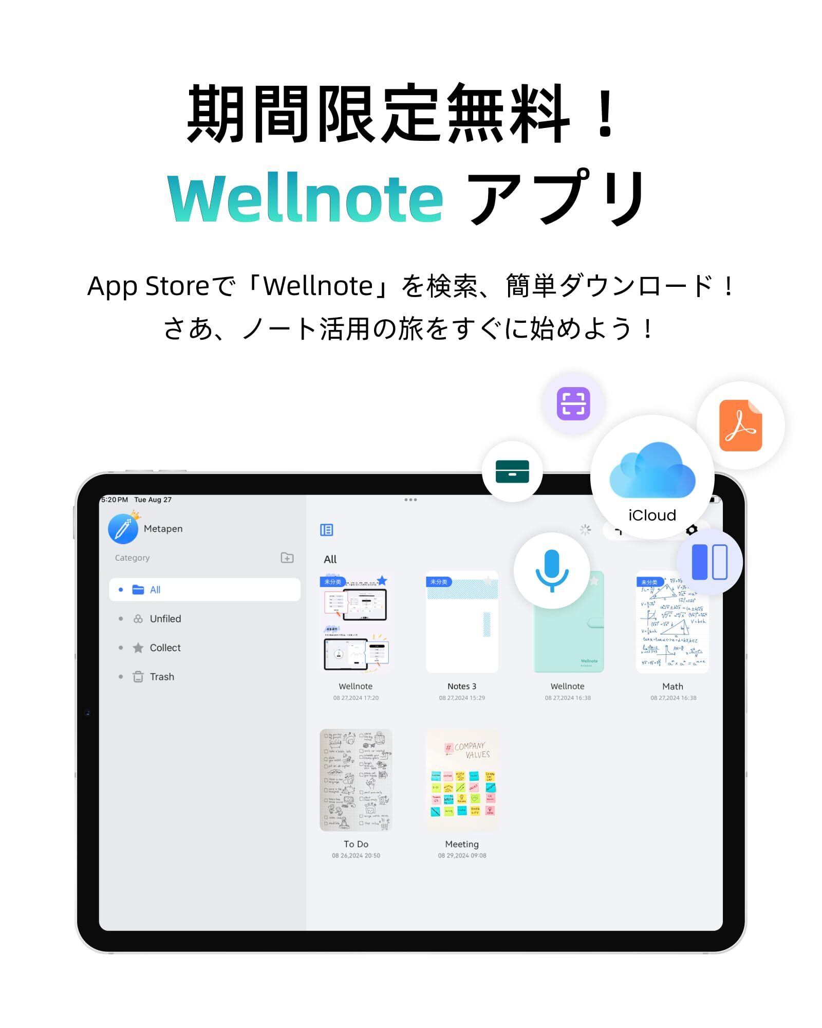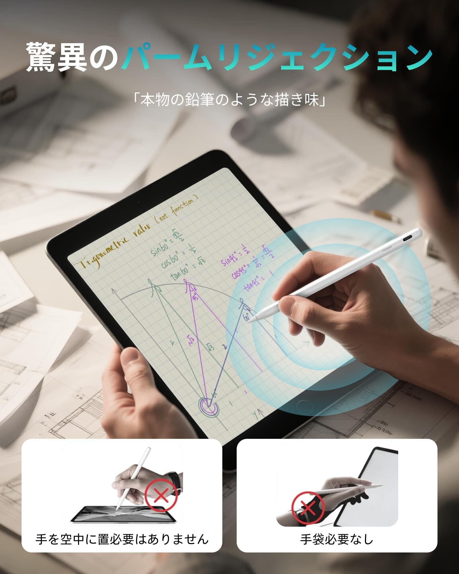 【使いやすさ& パームリジェクション& 磁気吸着機能】メタペン iPad ペン A8は、複雑なBluetoothペアリングが不要で、ペンの頭を2回タッチするだけで、すぐに使えます。パームリジェクション機能を搭載しており、デバイスの画面に手を置くことができ、長時間の作業でも腕が疲れません。磁気吸着機能があり、紛失を防ぎ、iPad側面にピタっとっついて収納・持ち運びに便利です。ご注意:磁気吸着機能対応: iPad Pro 12.9"、iPad Pro 11"、iPad Air 第4/5世代、iPad mini第6世代。磁気吸着機能非対応: iPad Pro 13/11 inch(M4)、iPad Air 13/11 inch(M2)、iPad第6/7/8/9/10世代、iPad Air第3世代、iPad Mini第5世代。