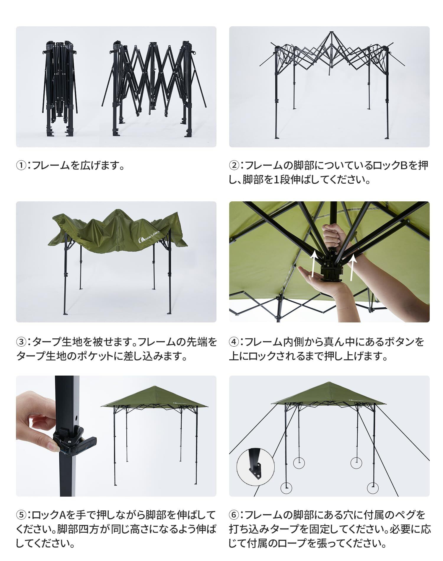 【便利なワンタッチテント】MOON LENCEのタープテントは新しいワンタッチ技術を採用し、取付時や撤収時、畳み傘のように、ワンタッチで簡単に操作できる同時に、手が挟まれる危険も防げます。