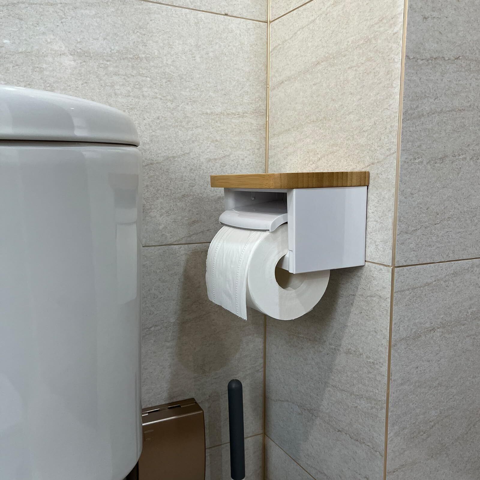 トイレットペーパーホルダー バスルーム ABSプラスチック楠竹木製製 切断機能付き DIY おしゃれ 2連 棚付き 賃貸対応 小物置き 簡単設置 補充楽 飾り棚 紙巻器 コンパクト設計 (竹ホワイト, シングル)
