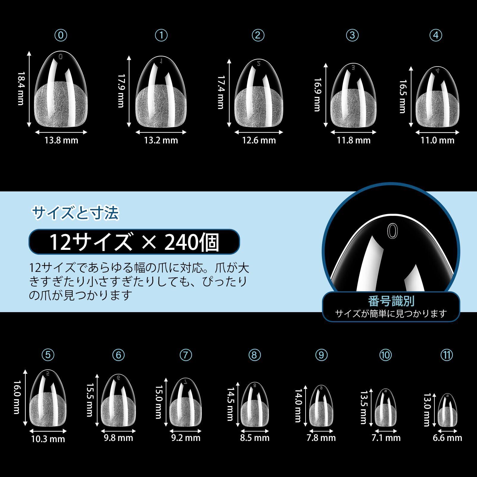 240個、12サイズ、大容量:超ショートアーモンド型ネイルチップ240個入り。1箱に12種類のサイズがあり、あらゆる爪のタイプに対応します。この大容量は費用を節約し、DIYネイル愛好家に最適です。爪のサイズと長さは人それぞれ異なるため、正確な寸法についてはサイズ表をご参照ください。