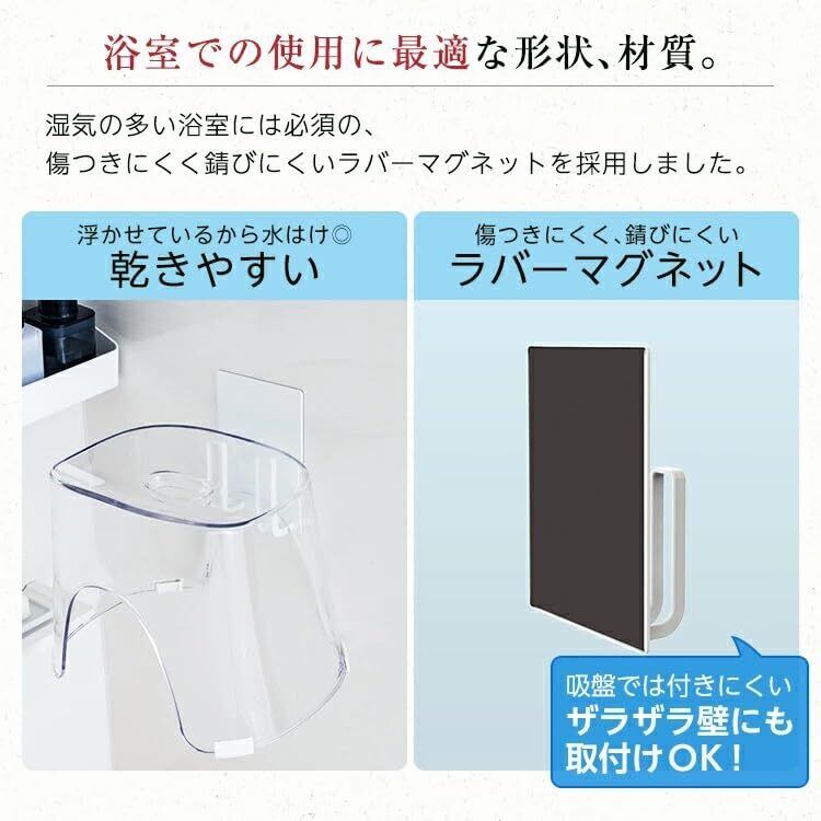 マグネットで取り付けも移動も簡単。置き場所に困る風呂いすを好きな場所に浮かせて収納できるフック。