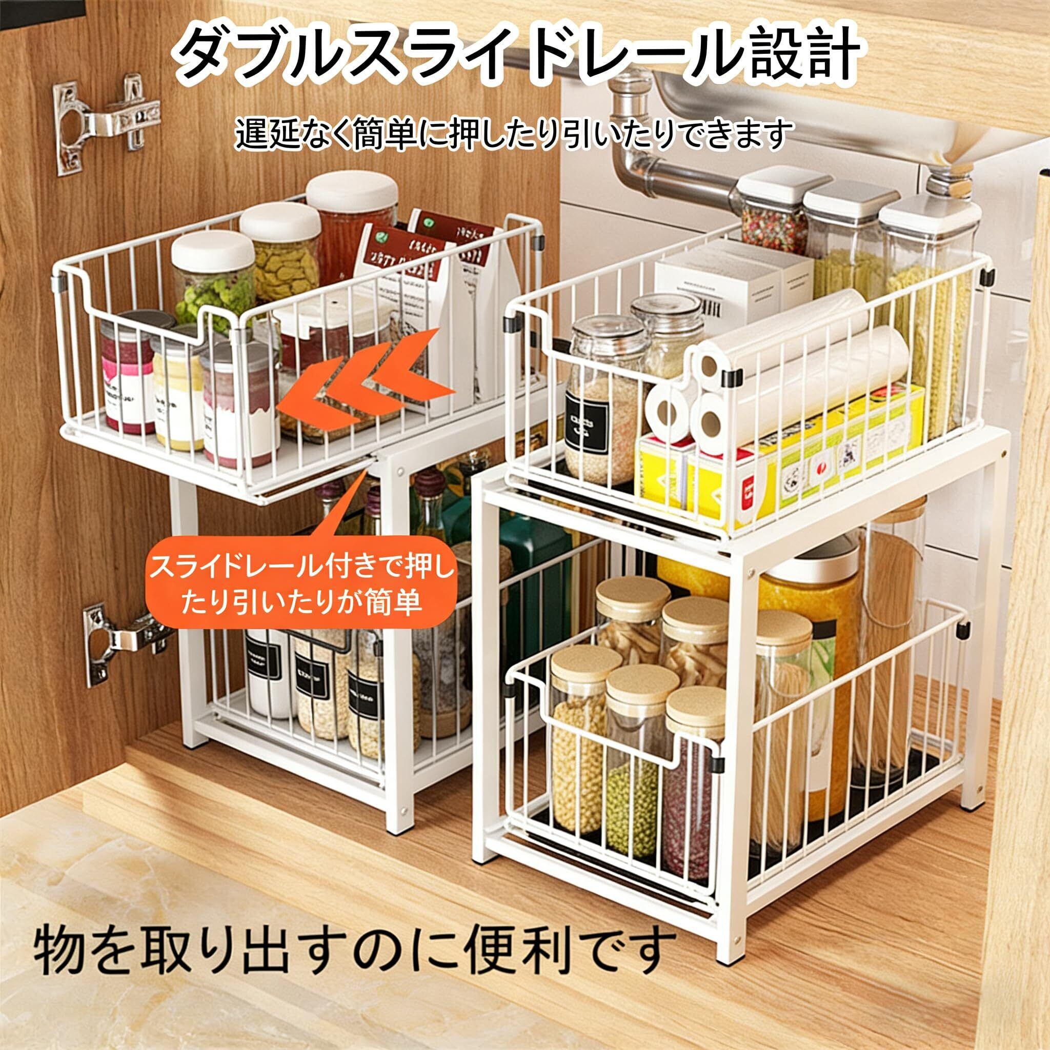 シンク下 収納 引き出し スライド しんくした収納ラック 引き出し 大容量 2段 キッチンシンク下収納ラック キッチンラック キッチン収納ラック 洗面台下 収納 シンク下 組立簡単 幅26×奥行き37×高さ38.5cm 省スペース ブラック (ホワイト)