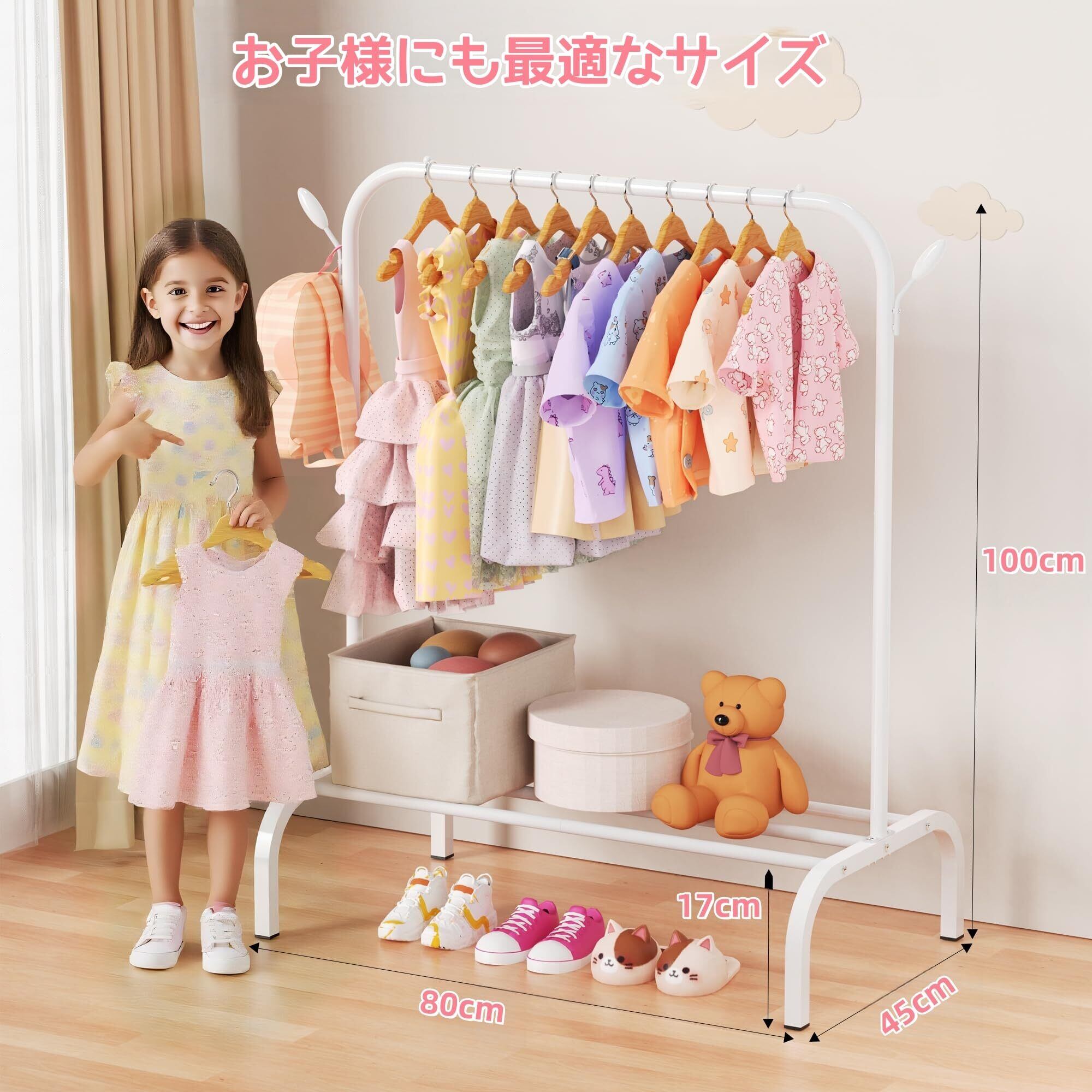 ハンガーラック 子供用 頑丈仕様、収納棚 & フック付き、幅 80cm 小型洋服ラック - コスチューム/プリンセスドレス/靴用、ホワイト