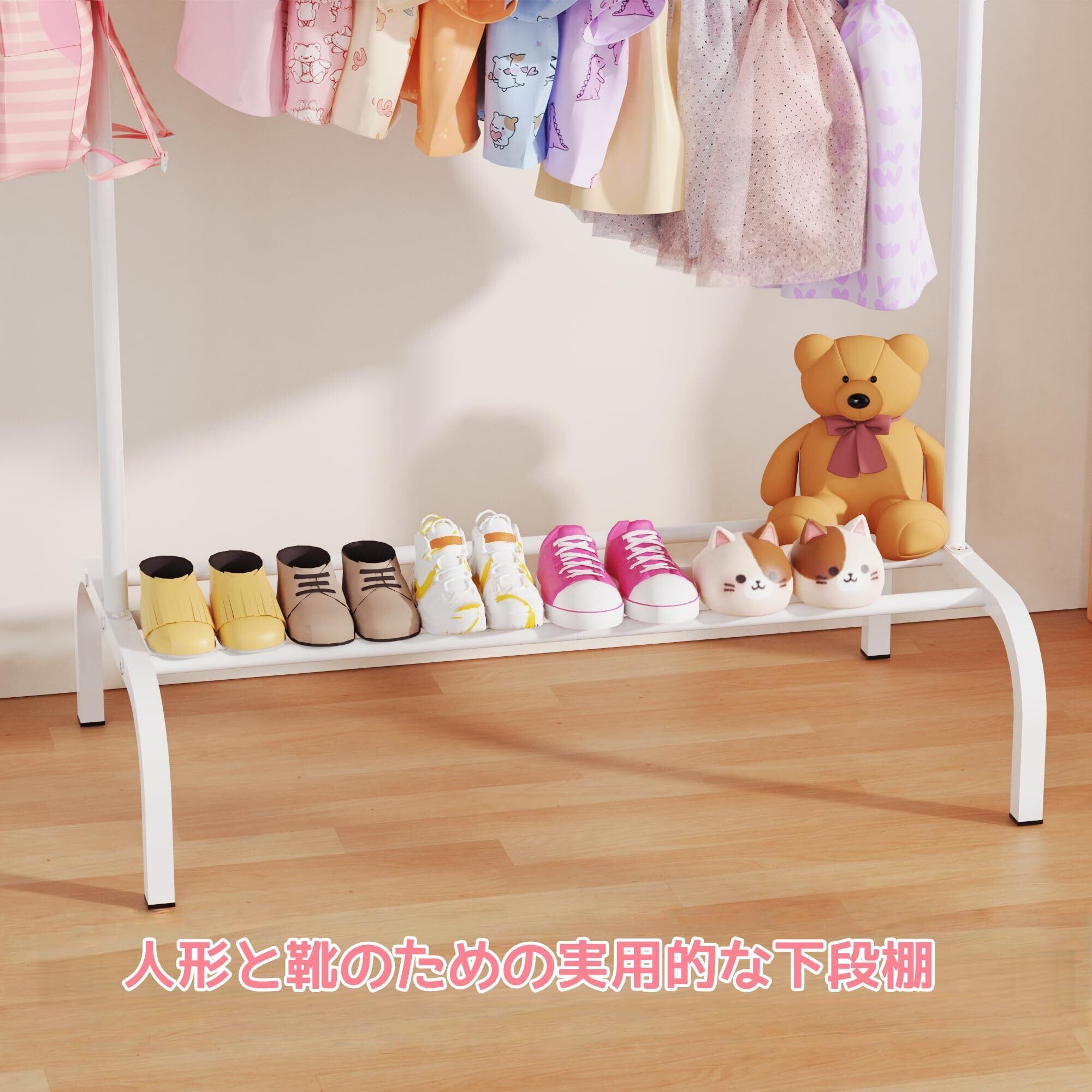 【収納棚とフック付き】下段の棚では靴、おもちゃ、収納ボックスなどを整理できるほか、サイドにはバッグや帽子を掛けられるフックが 2 つ付いています。さらに、ハンガー部分には滑り止めストッパーが設けられているので、服が滑り落ちるのを防ぎ、いつも整理整頓がしやすいです。このショート丈の洋服ラックは、ハンガーラック 子供用クローゼットとしてだけでなく、お部屋を華やかにするデコレーションラックとしても大活躍します