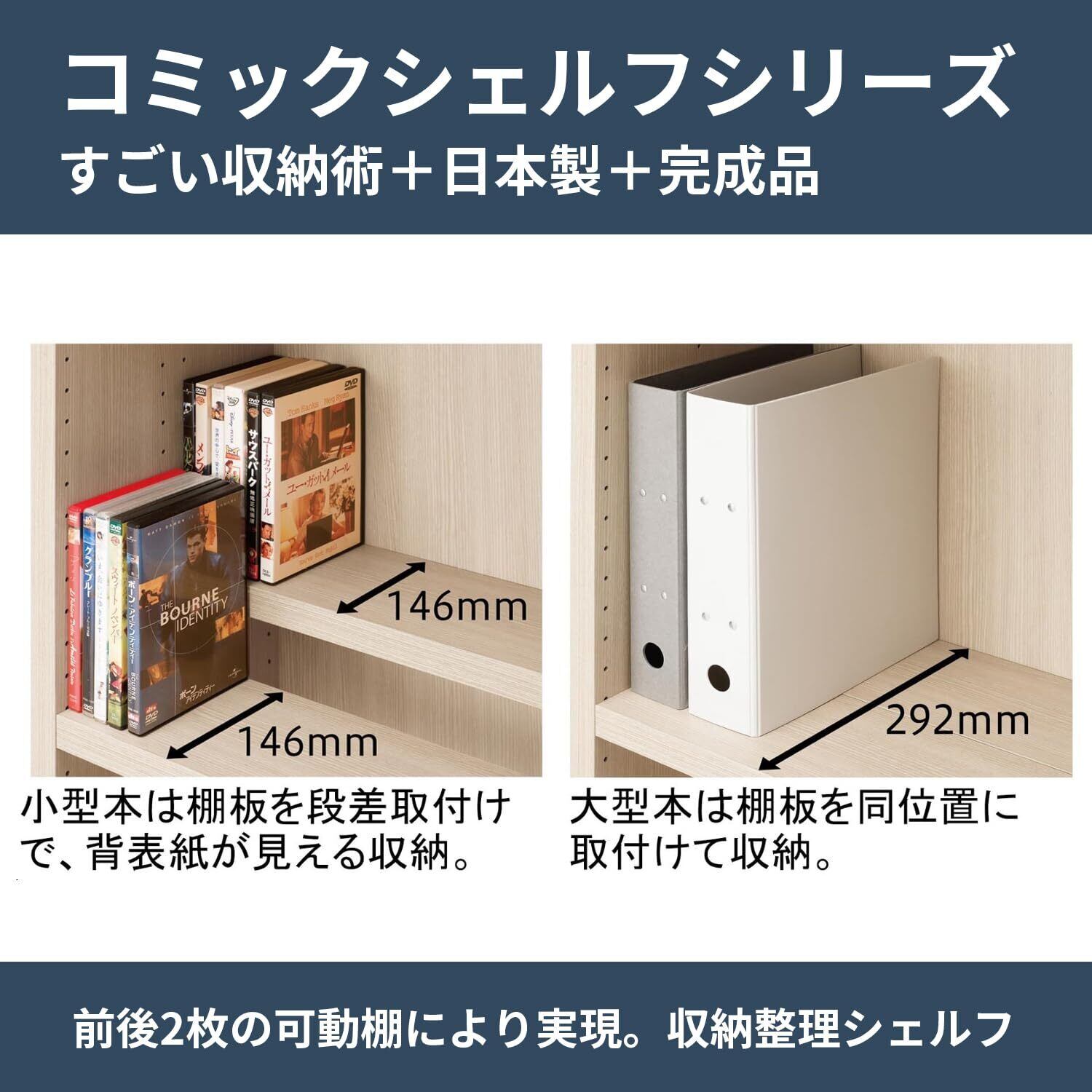 前後2枚の可動棚により実現した、超収納整理シェルフ。コミック・単行本・CD・DVD・~A4ファイルまで対応。