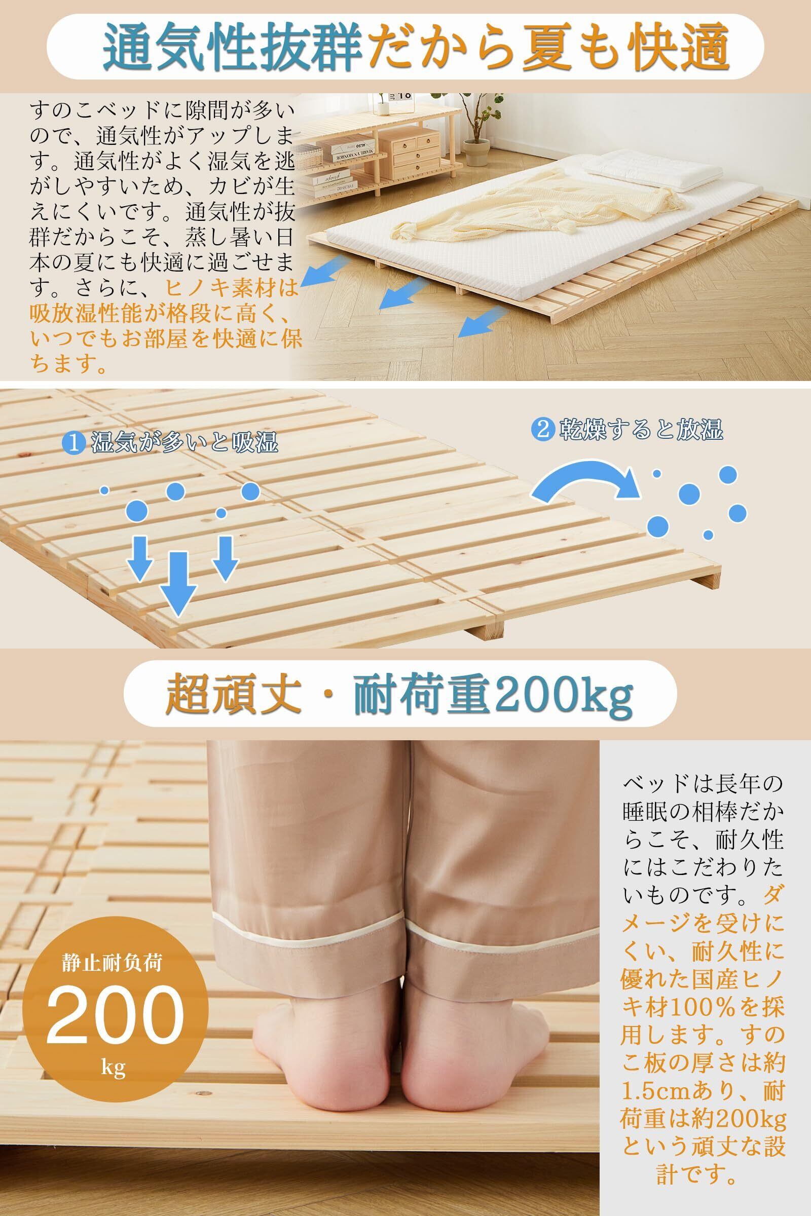 【超頑丈・耐荷重200kg】ベッドは長年の睡眠の相棒だからこそ、耐久性にはこだわりたいものです。このベッドフレームはダメージを受けにくい、耐久性に優れた国産ヒノキ材100%を使用しています。すのこ板の厚さは約1.5cmあり、耐荷重は約200kgという頑丈な設計です。